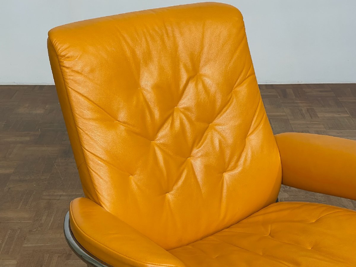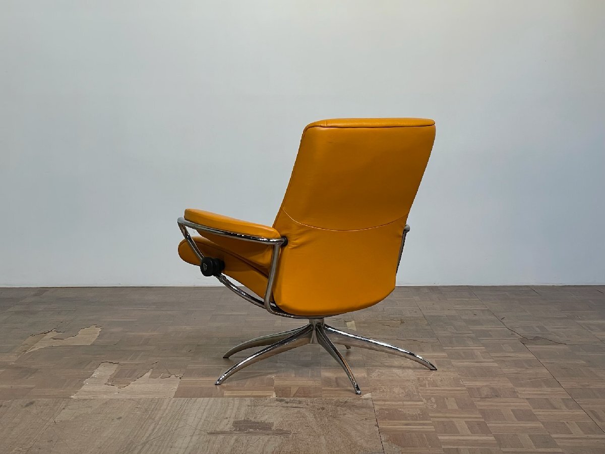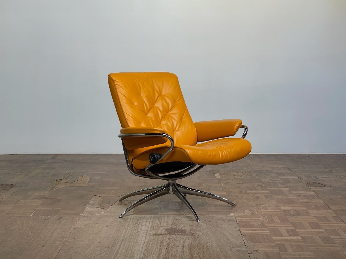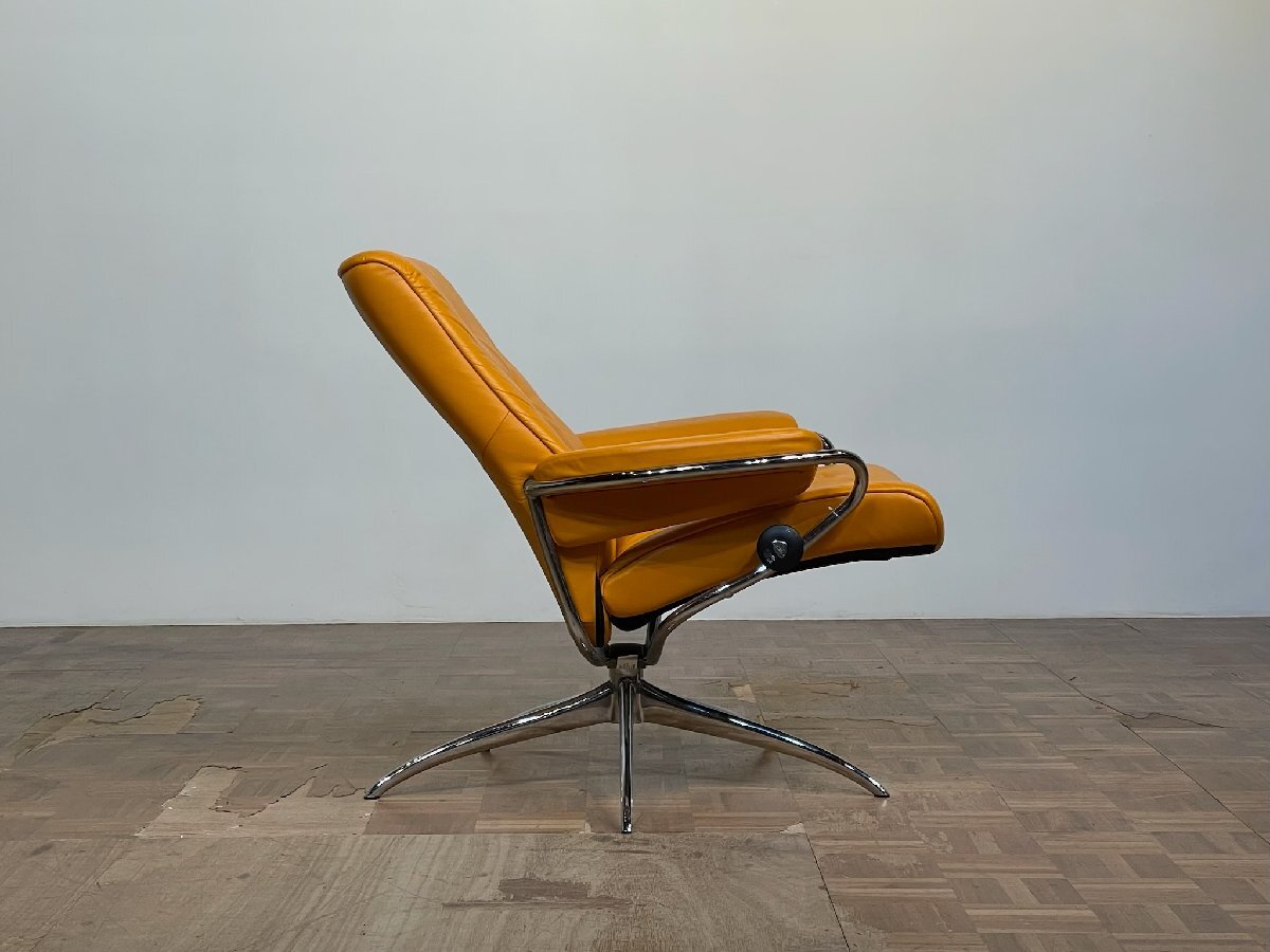 フレームと台座にクローム仕上げの光沢を配しジュエリーのような美しいチャームを持たせたデザインの美しいデザインリクライニングチェア。Ekornes / Stresslessより。