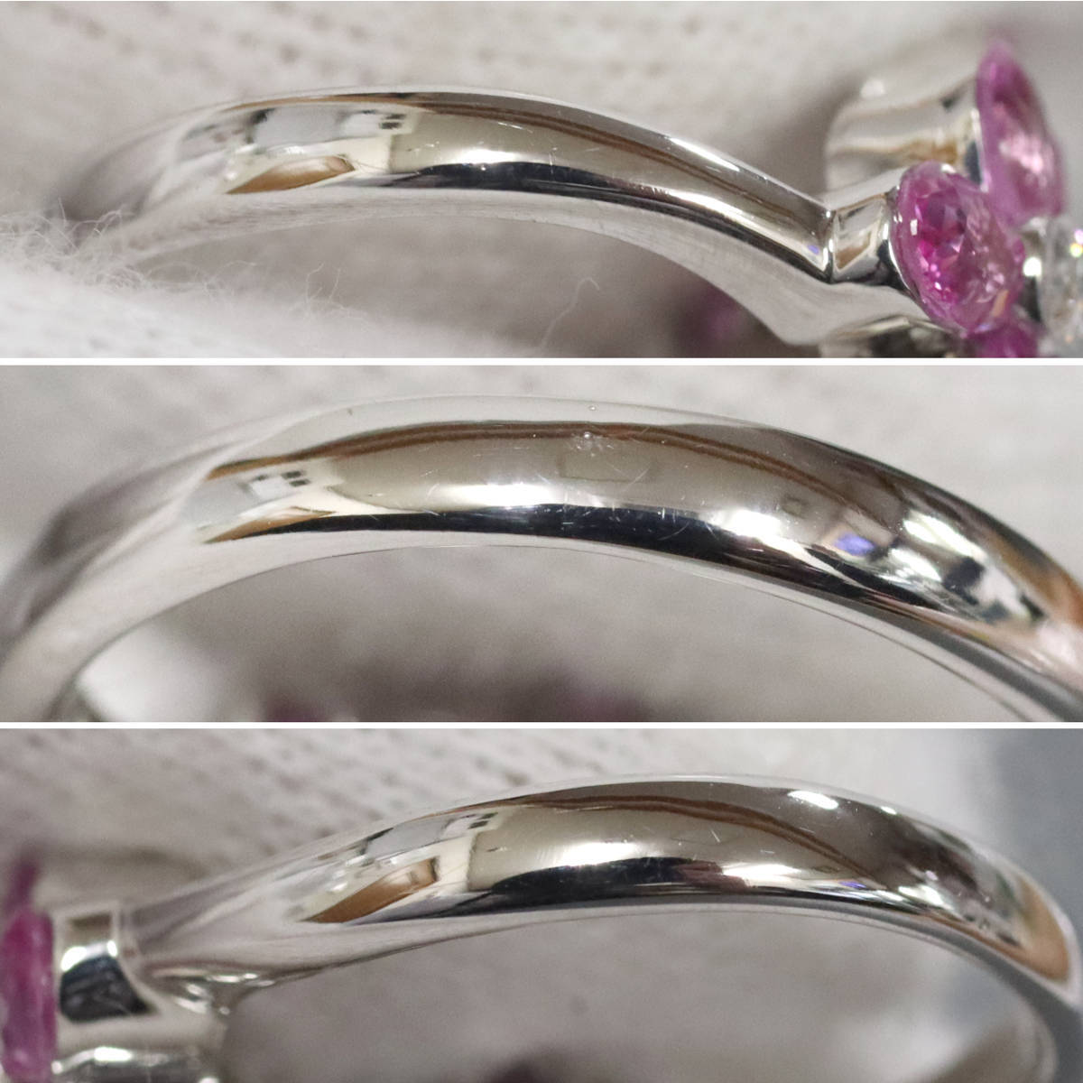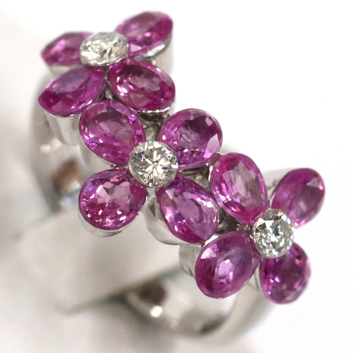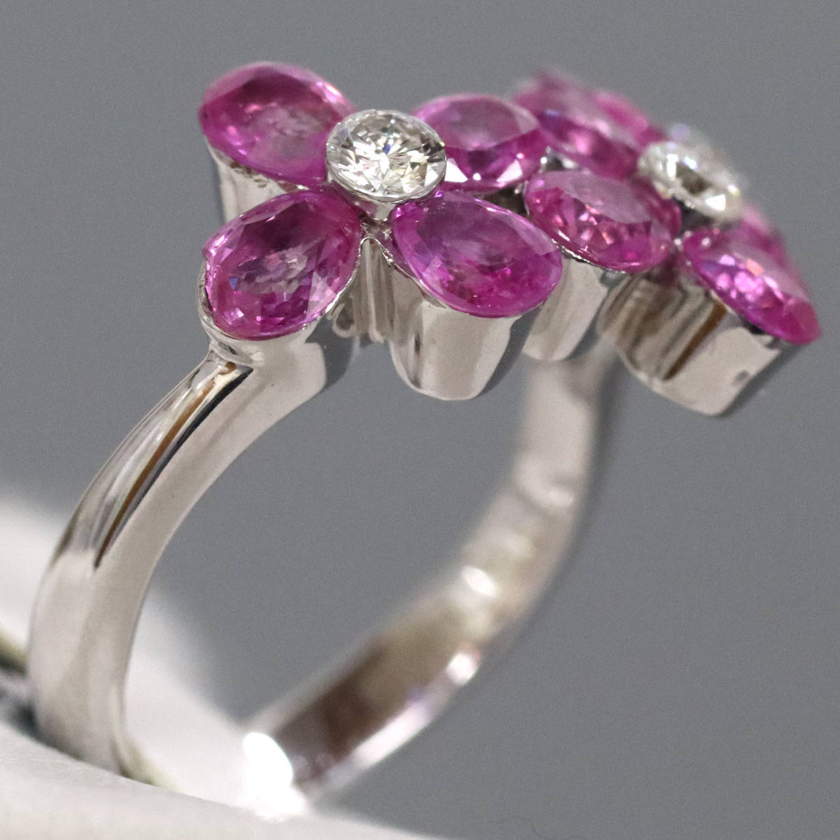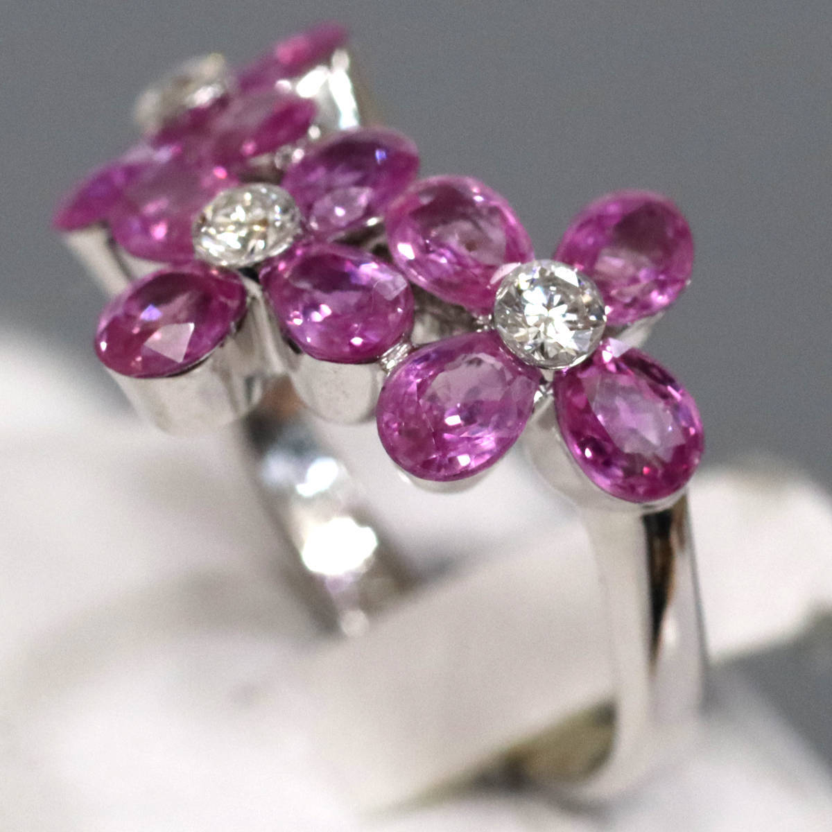 | K18WGピンクサファイアダイヤモンドリングの中古品です。 可愛らしいフラワーモチーフです。 サファイアは一部わずかに表面が欠けているものがあります。 紫がかったピンク色で、彩度・明度が高く、透明感があります。 わずかにインクルージョンがありますが、肉眼では見えません。 ダイヤモンドはわずかに黄色がかったお色味ですが、照りよく輝きます。 ダイヤモンドもわずかにインクルージョンがありますが、肉眼ではわかりません。 地金にはサイズ直しの跡があり、小傷があります。