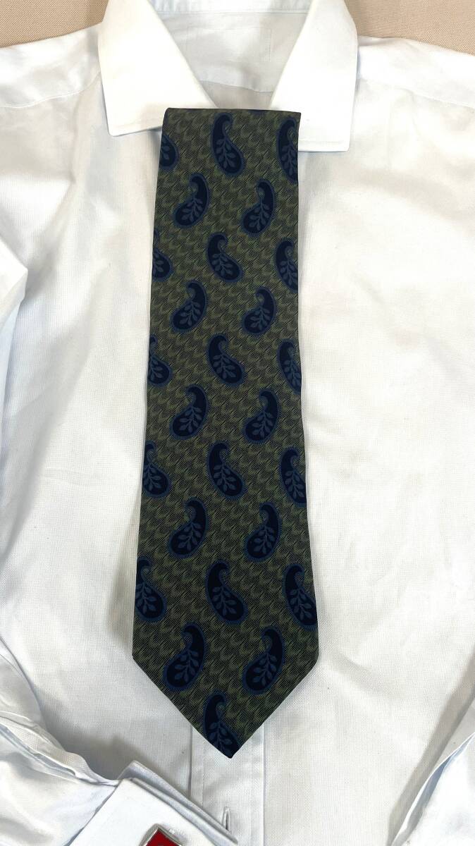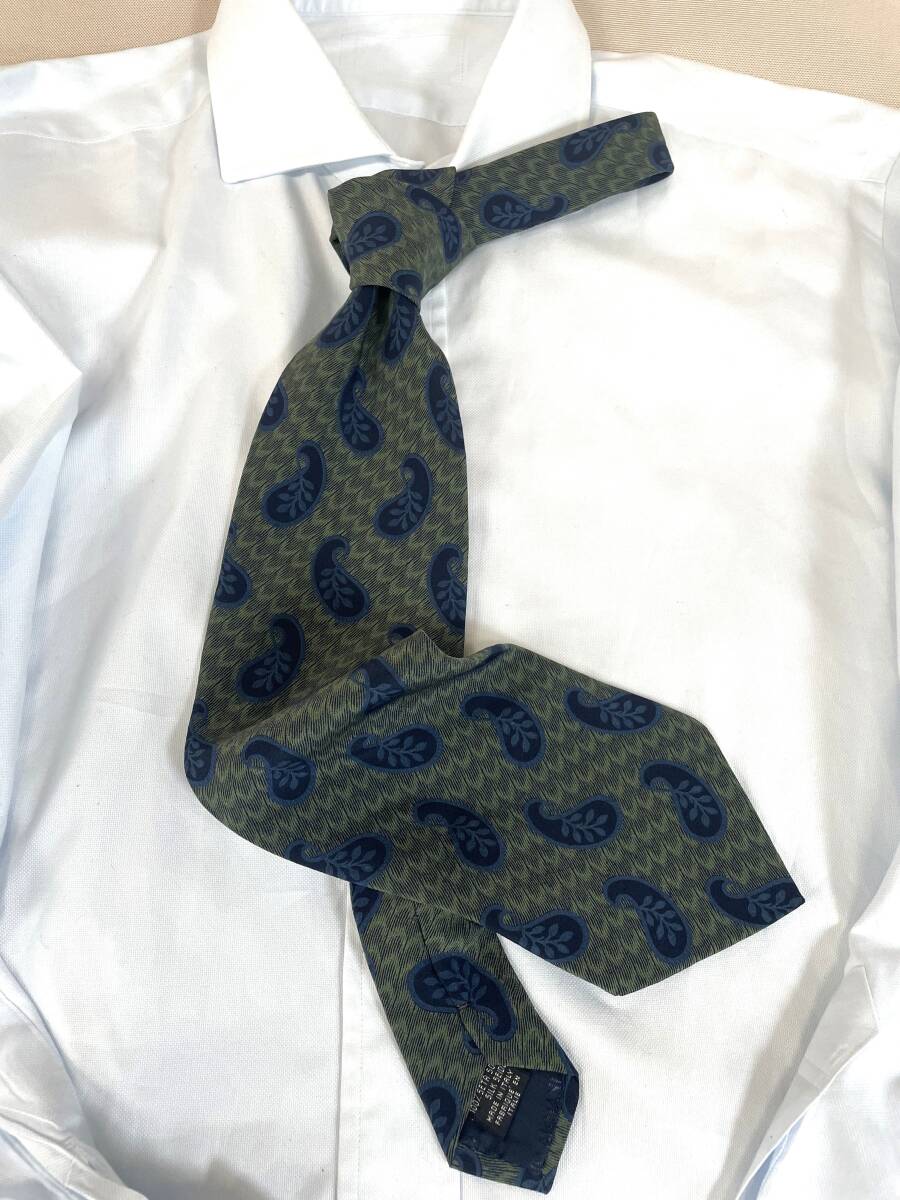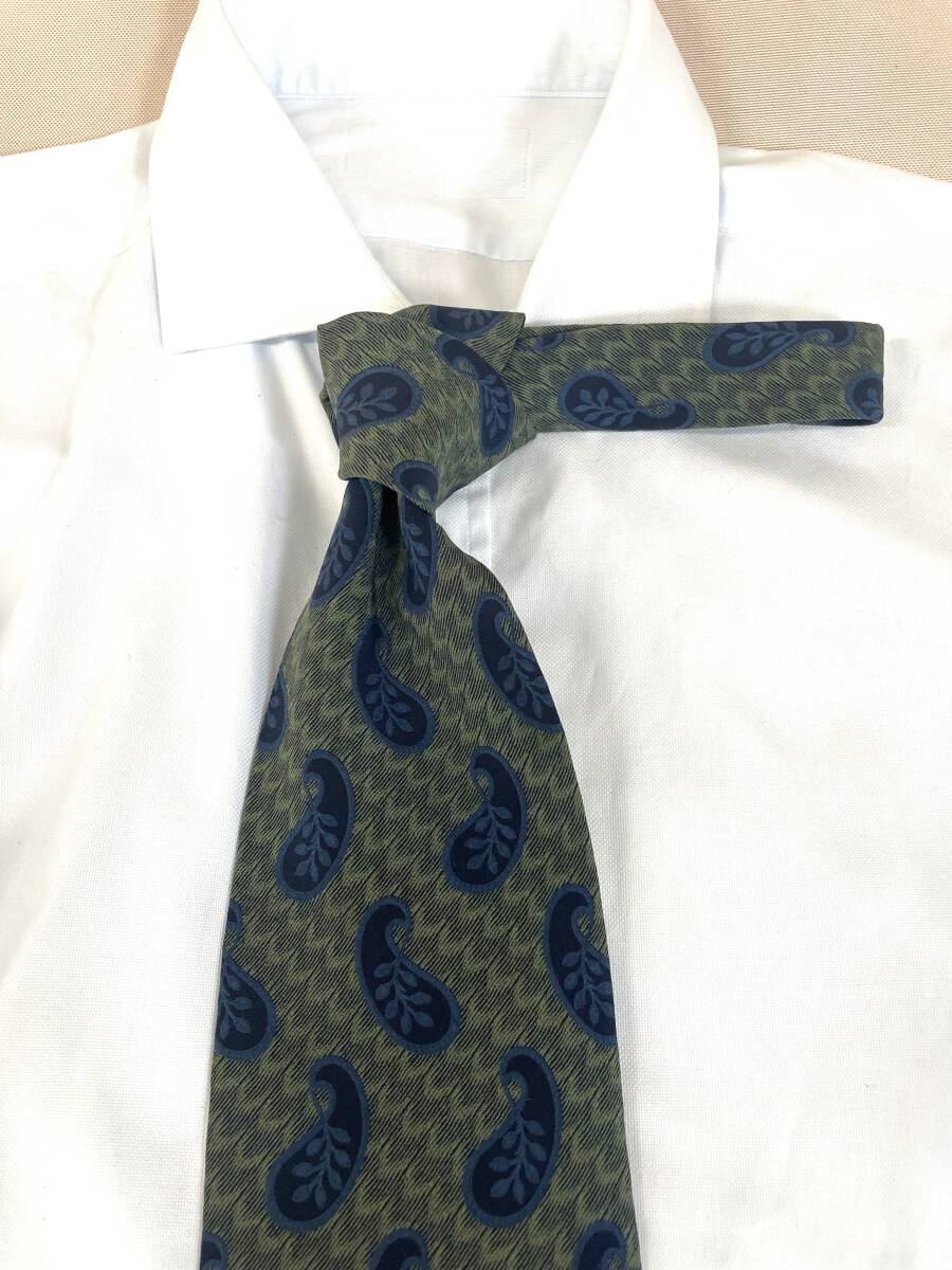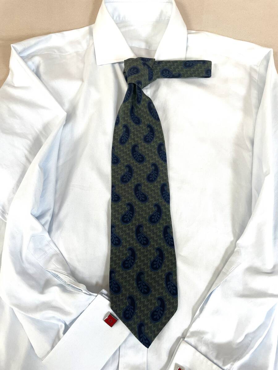 深い緑に立体感のある落ち着いたデザインとなっており、スーツに映える落ち着いた柄でございます。