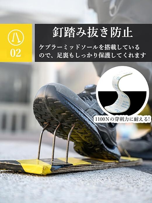【つま先保護&踏み抜き防止】つま先部分に鋼製の先芯を入れた、金槌や刃物などからつま先を保護できます。アウトソールと中敷きの間にはケブラー 繊維ミッドソールを入れた、釘やガラスなどの鋭いものから足裏を守ります。
