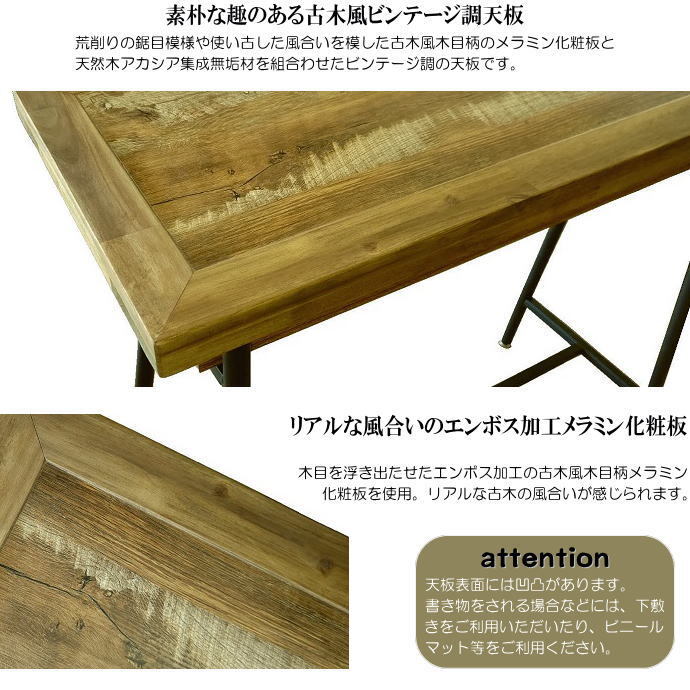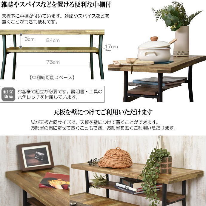| 【材質】 | 天板:古木風木目柄メラミン化粧板・アカシア集成無垢材(縁)/中棚:メラミン化粧板/脚:アイアン | |
