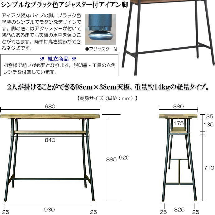 | 【商品特徴】 | ◇アカシア集成無垢材を縁に使用した古木風ビンテージ調天板にモダンなアイアン製脚を組合わせたカウンターテーブル単品販売。 ◇レトロモダンの優しくぬくもりのあるお部屋づくりに最適です。 ・高さ92cmで幅98cm×奥行38cm天板のハイタイプカウンターテーブル。リビングやキッチン様々な場所でご利用いただけます。 ・荒削りの鋸目模様や使い古した風合いを模した古木風木目柄のメラミン化粧板と、天然木アカシア集成無垢材を組合わせたビンテージ調の天板です。 ・素木目を浮き出たせたエンボス加工の古木風木目柄メラミン化粧板を使用。リアルな古木の風合いが感じられます。(天板表面には凹凸があります。書き物をされる場合などには、下敷きをご利用いただいたり、ビニールマット等をご利用ください。) ・天板下に中棚が付いています。雑誌やスパイスなどを置くことができて便利です。 ・脚が天板と同サイズで、天板を壁につけて置くことができます。お部屋の隅に寄せて置くこともでき、お部屋を広くご利用いただけます。 ・アイアン製丸パイプの脚。ブラック色塗装のシンプルでモダンなデザインです。 ・脚の底にはアジャスターが付いています。凹凸のある床でも、ネジ式で簡単に高さ調節ができ、天板の水平を保つことができます。 ・2人が掛けることができる98cm×38cm天板で、重量約14kgの軽量タイプです。 ・お客様で組立が必要となります。説明書・工具の六角レンチを同梱しております。 | |