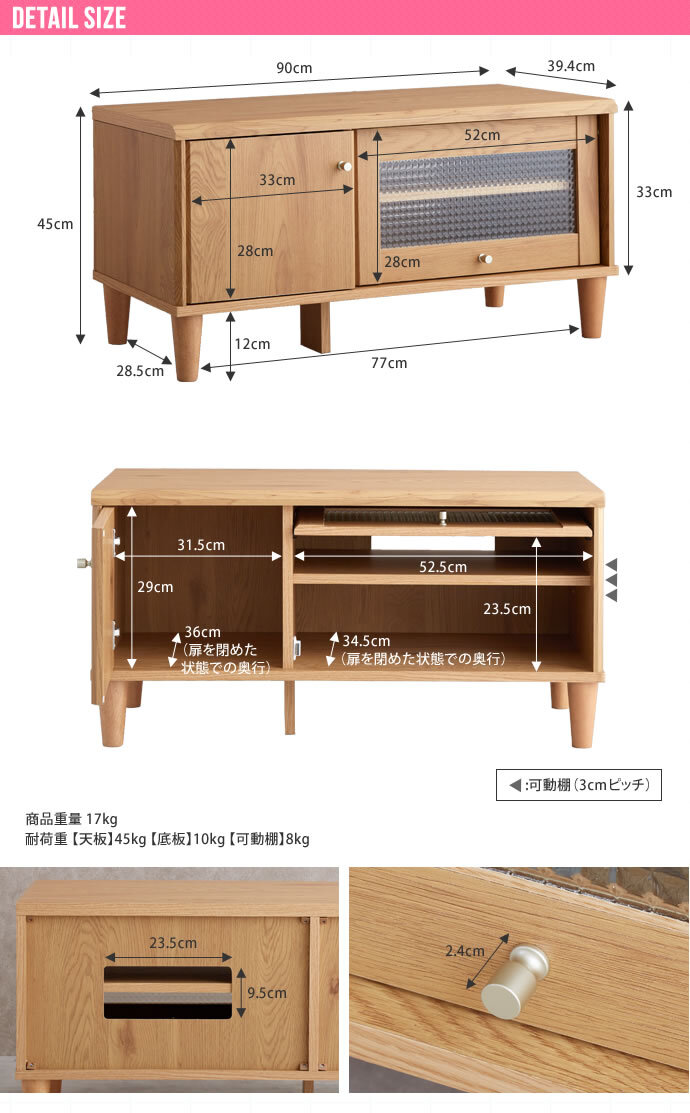 【耐荷重】天板:約45kg、底板:約10kg、可動棚:約8kg