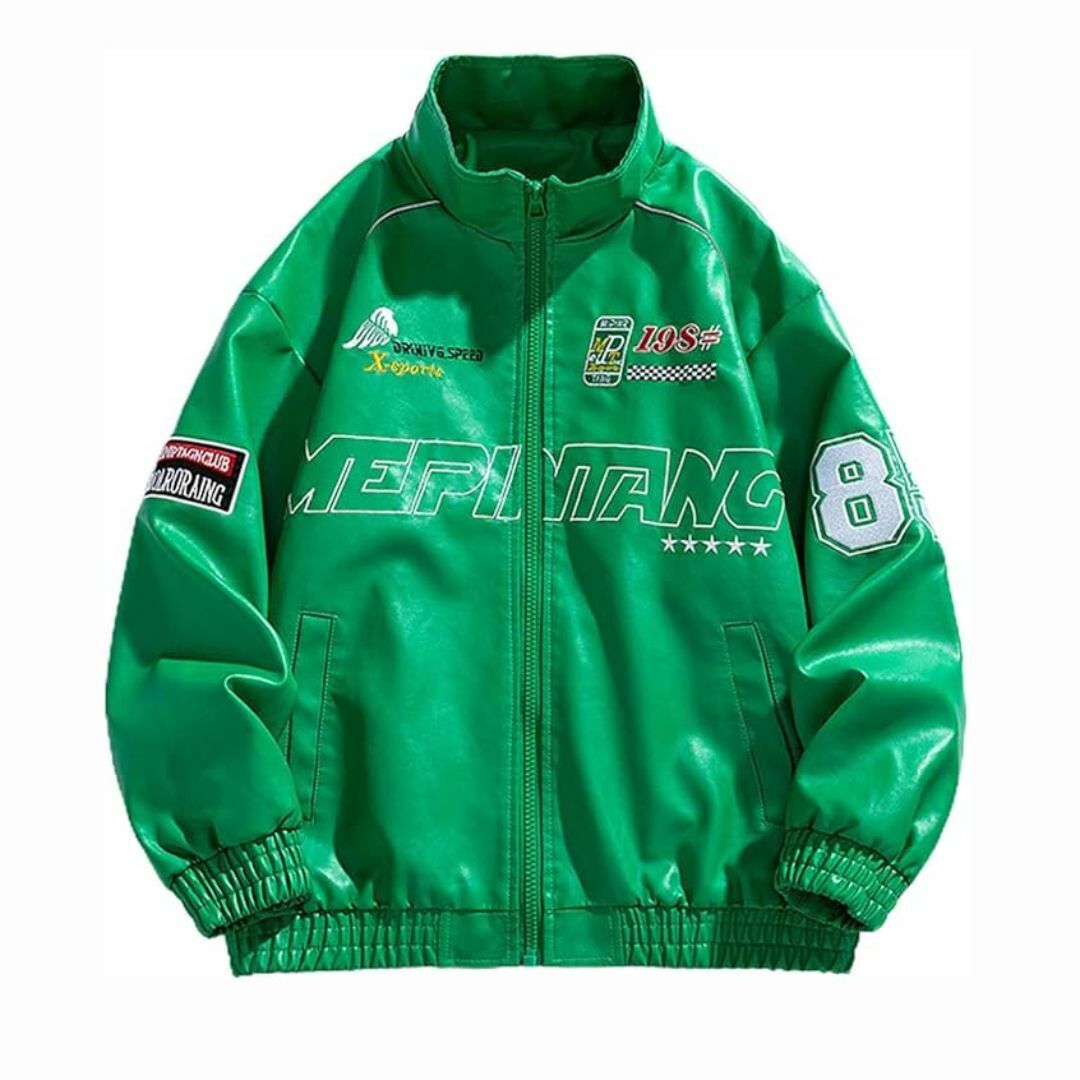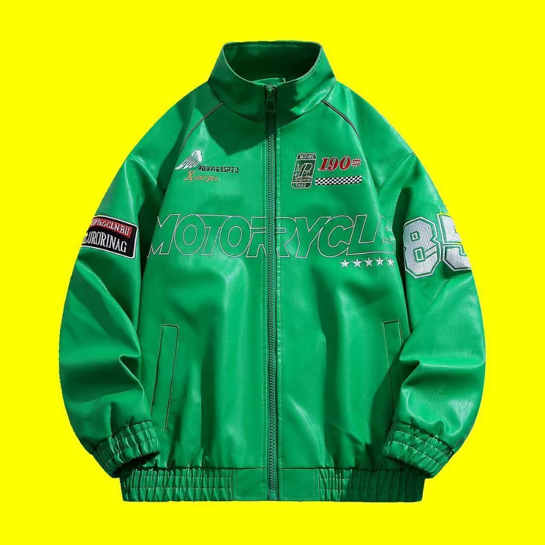 L メンズ おしゃれ 刺繍 フェイクレザージャケット PU革ジャン パーカー 無地 緑