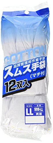 ・ホワイト 1810・通年用・綿生地を使用して作られたマチ付作業手袋です。説明 ・綿生地を使用して作られたマチ付作業手袋です。 手袋の指と指との間に生地をつけたことにより立体的なフィット感を生み手の動きが指先までスムーズに使用できます。 ・素材:綿100% ・サイズ:LL ・ケース入数:100打