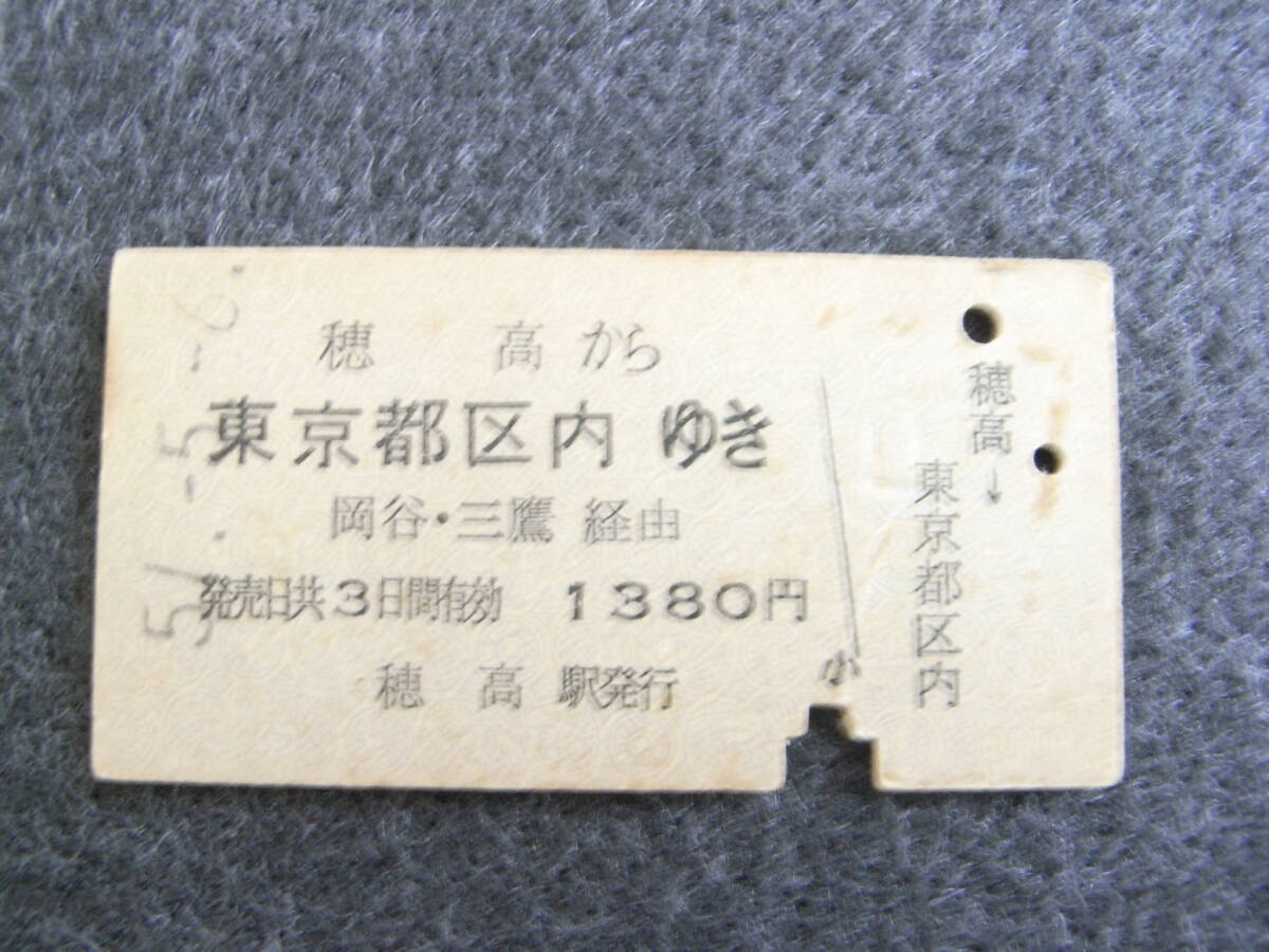 大糸線 穂高から東京都区内ゆき 岡谷・三鷹経由 1380円 昭和51年5月6日 穂高駅発行 国鉄