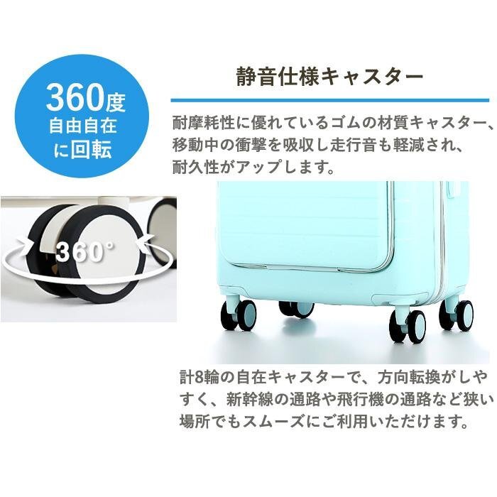 計8輪の自在キャスターで、方向転換がしやすく、新幹線の通路や飛行機の通路など狭い場所でもスムーズに ご利用いただけます。