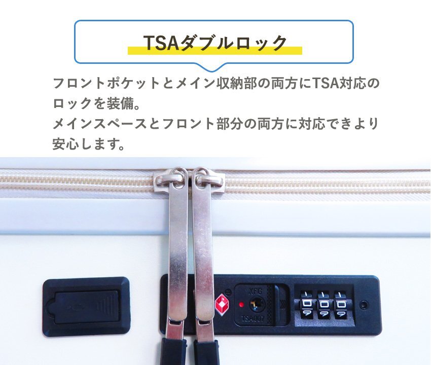 フロントポケットとメイン収納部の両方にTSA対応のロックを装備、メインスペースとフロント部分の両方に 対応できより安心します。