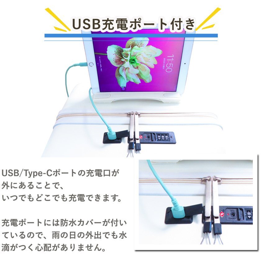 充電ポート付きスーツケースにモバイルバッテリーを収納するポケットがついており、USB/Type-Cポートの充電口が外にあることで、 いつでもどこでも充電できます。