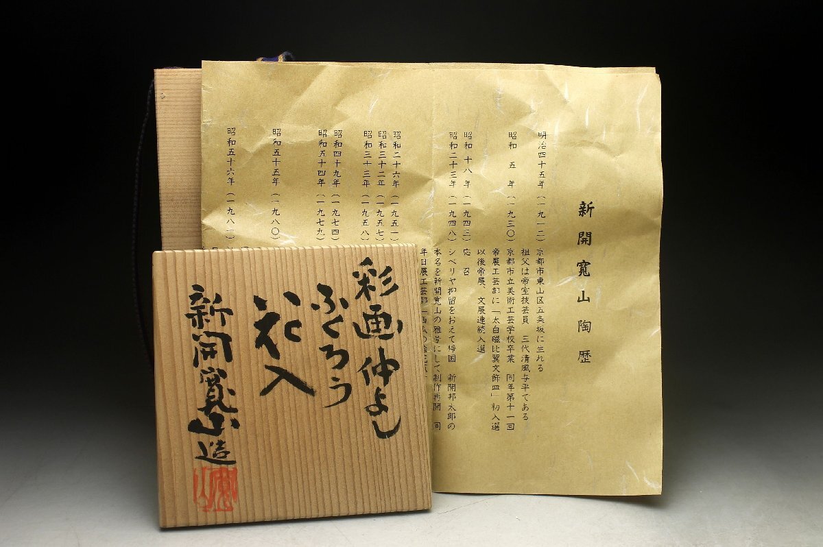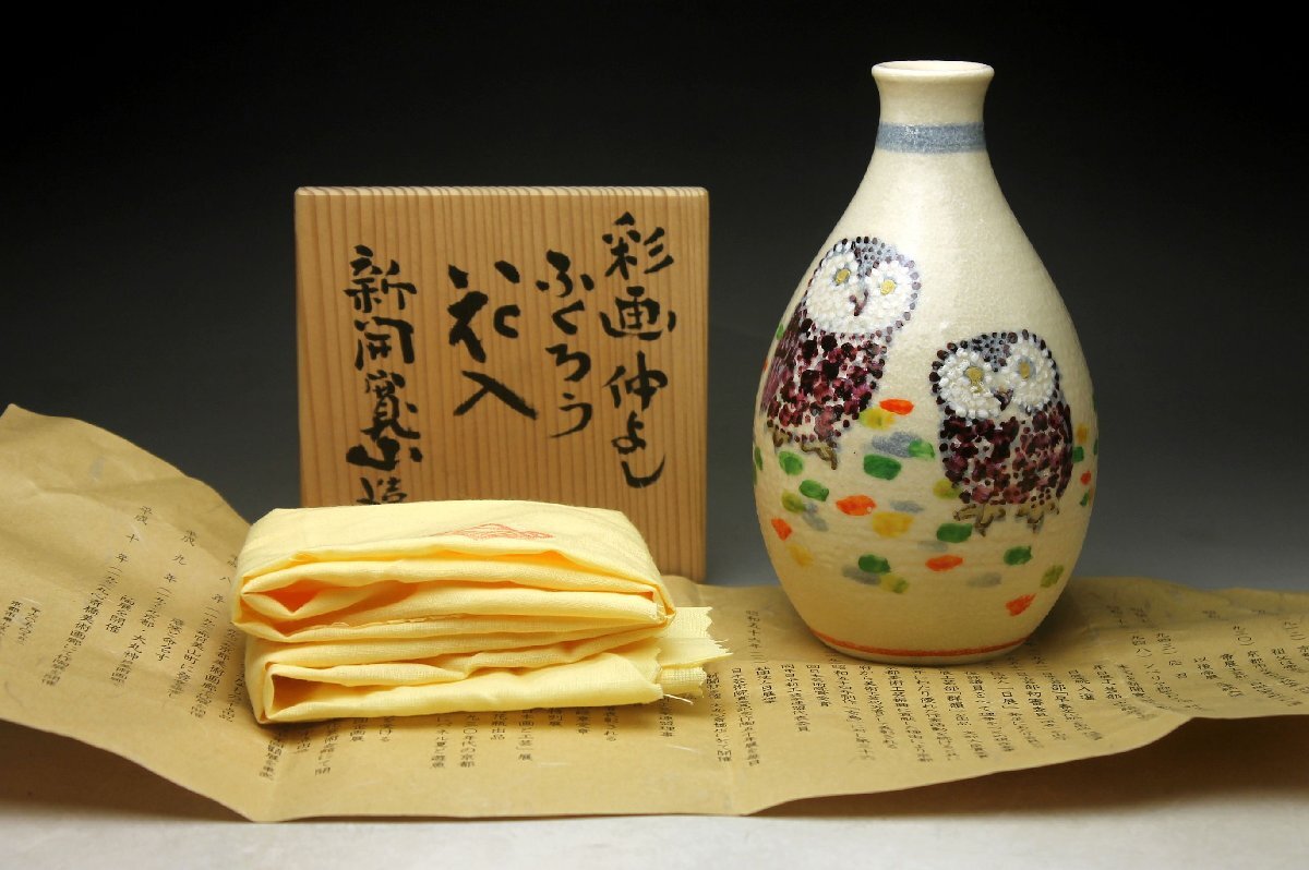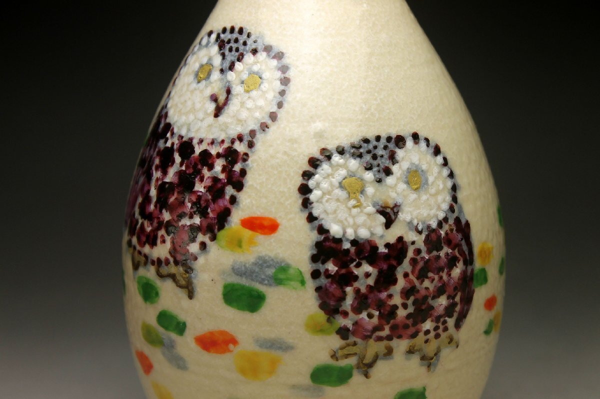 【余韻】 日本芸術院賞受賞陶芸家 【新開寛山】造 彩画仲良しふくろう 花入★共箱 無傷美品 <同梱可>