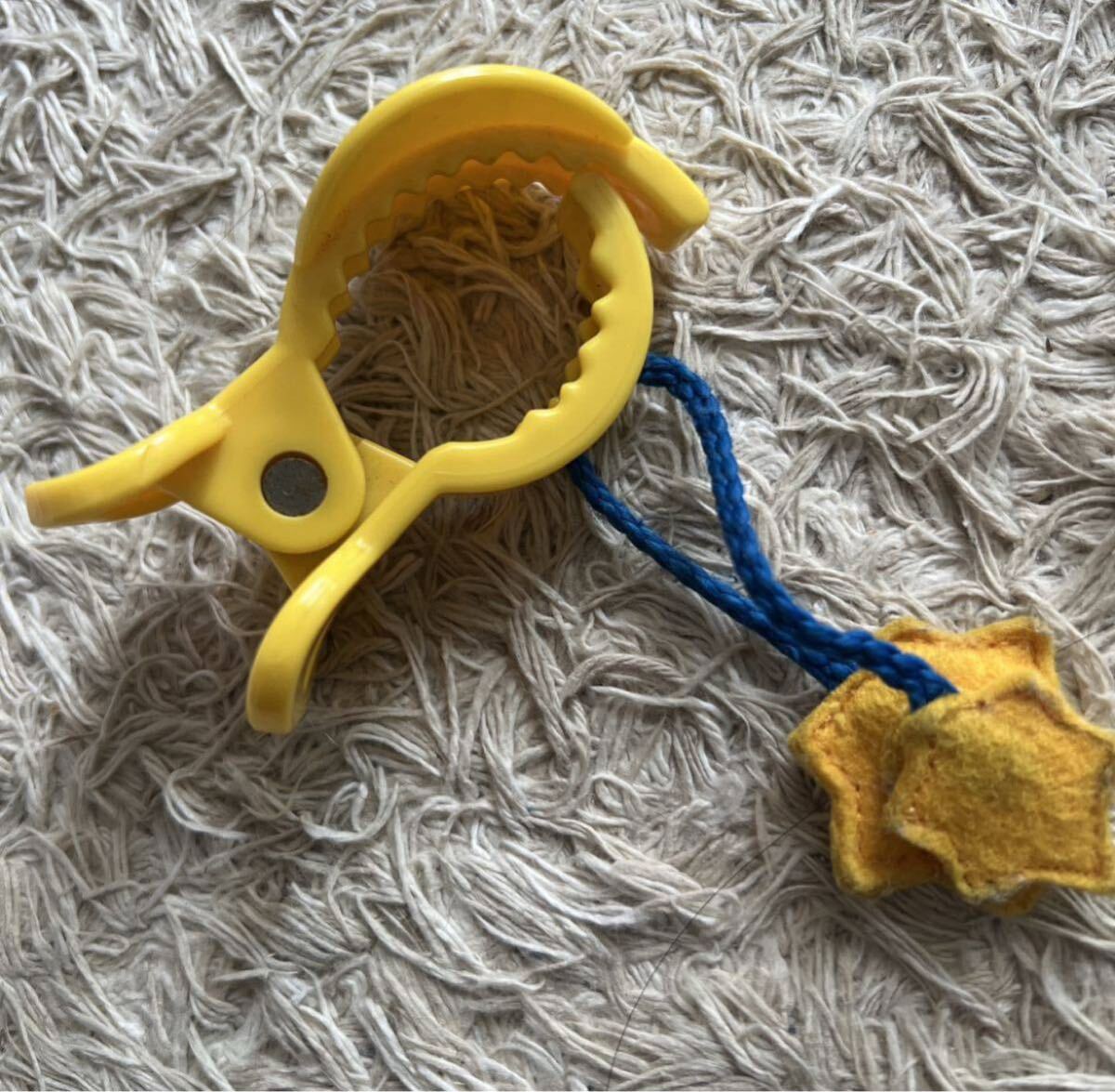 ベビーカーにクリップで挟んでつけるベビーカートイです。