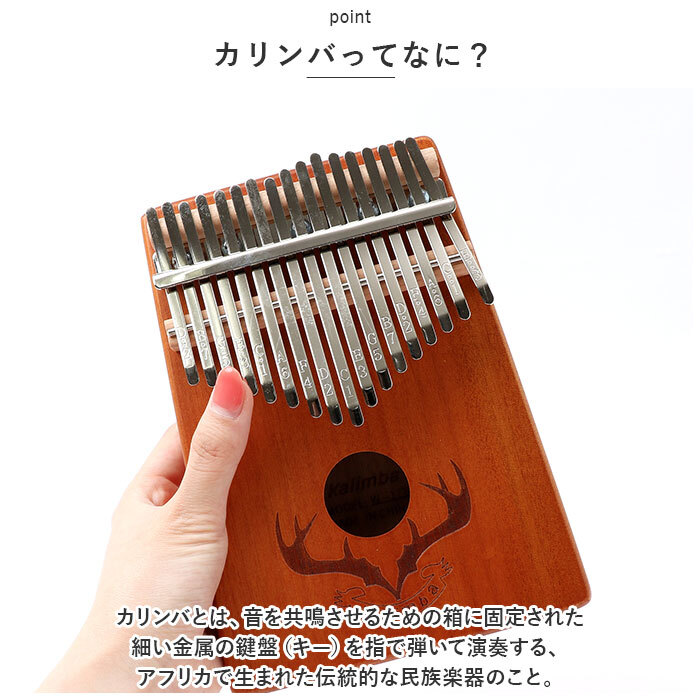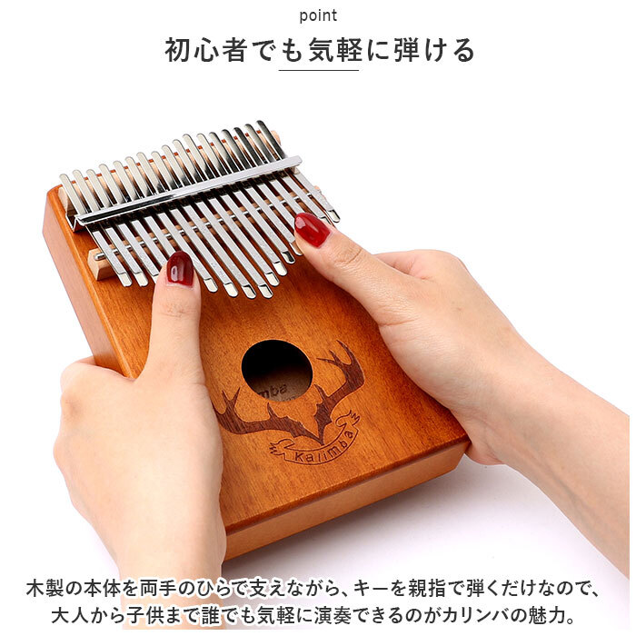 | 商品説明 | ・・オルゴールのような優しい音色に心癒される♪手軽に弾ける17キータイプのカリンバ。 ・【カリンバってなに?】 ・カリンバとは、音を共鳴させるための箱に固定された細い金属の鍵盤(キー)を指で弾いて演奏する、アフリカで生まれた伝統的な民族楽器のこと。 ・【初心者でも気軽に弾ける】 ・木製の本体を両手のひらで支えながら、キーを親指で弾くだけなので、大人から子供まで気軽に演奏できるのがカリンバの魅力。 ・【木目の美しいマホガニー材】 ・カリンバ本体には、手のひらに優しく馴染む桃花心木(マホガニー)を使用。温かみのある音色と、使い込むほどに味わい深く変化する色合いは天然木ならではのもの。 ・【アルファベットの音階付き】 ・鍵盤(キー)には、アルファベットの音階と番号が刻まれているため、視覚的にも演奏がしやすい設計。17キータイプのカリンバでは、約2オクターブの音域を演奏可能。 ・【音色のアレンジ自在】 ・演奏に慣れてきたら、本体裏側の2つのバックサウンドホールを中指や薬指で塞ぐことで、音の響きを変えたり、音色にバリエーションを加えることも可能。 ・【練習曲の楽譜付きブックレット】 ・「ユア・マイ・サンシャイン」などの練習曲の楽譜や、チューニング方法を解説したブックレット付き。(※ブックレット説明文は、すべて英語表記となります。) ・【メンテナンスツールも充実】 ・演奏時の視認性をアップさせる2色のキーステッカー、指先の痛みを和らげる指サック、キー調律用ハンマー、お手入れ用クロスも付属し、メンテナンス用ツールも充実。 ・【インテリアのワンポイントに】 ・ビンテージ感のあるマホガニー材の表面には、蓮の花や水滴など幾何学模様のモチーフが彫刻され、リビングに飾っておくだけでも素敵なインテリアに。 ・【コンパクトに持ち運び】 ・膝の上でも机でもどこでも気軽に演奏開始!ベロア生地で仕上げた収納袋が付属しているので、お出掛け先にも気軽に連れていける! ・【ギフトにもオススメ】 ・ギターやピアノは難しいかも・・・と思われていた方でも手軽に始められるカリンバ。おうち時間を豊かに過ごしたい方はもちろん、誕生日や母の日など、大切な方へのギフトにもオススメ。 |