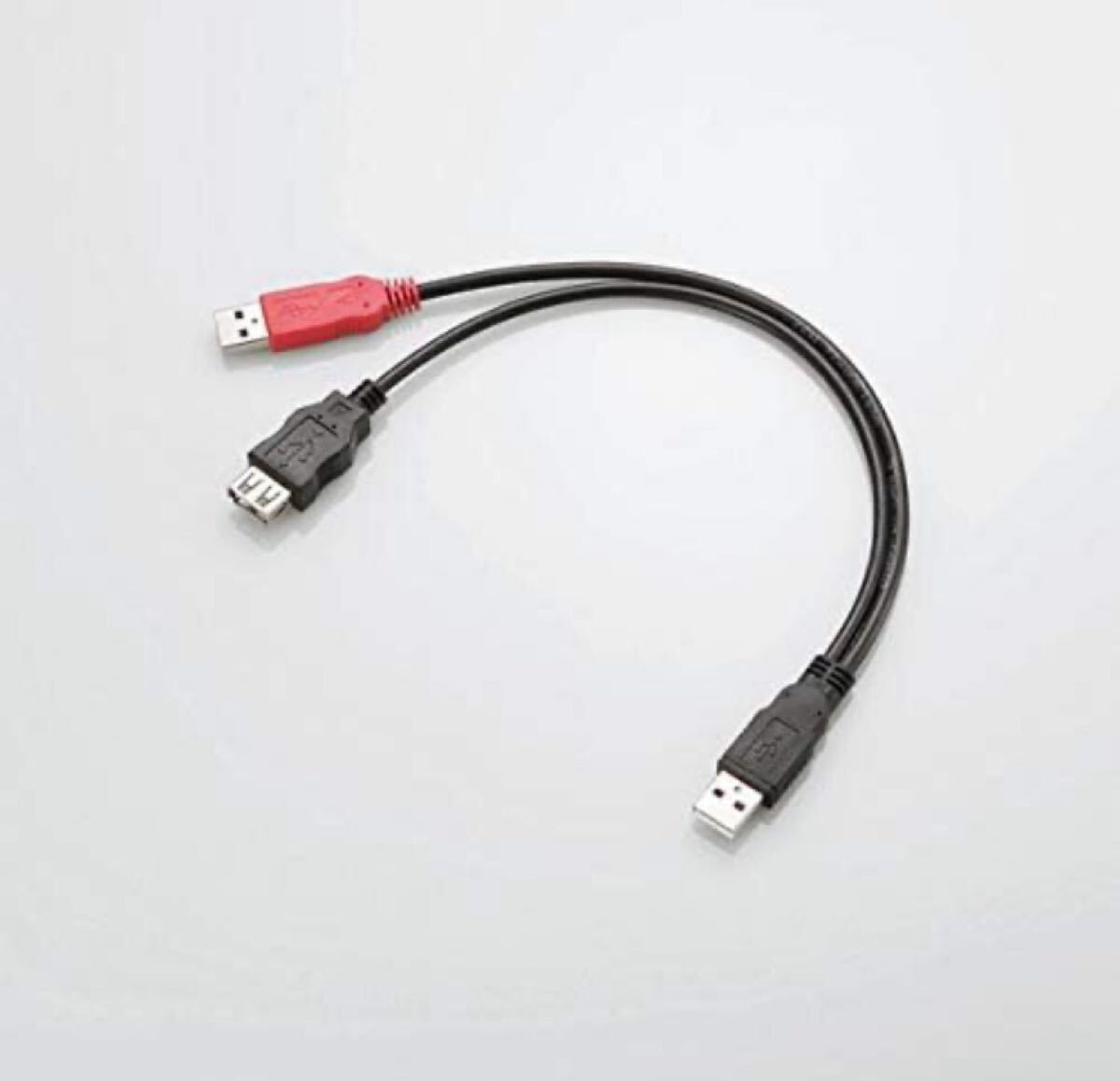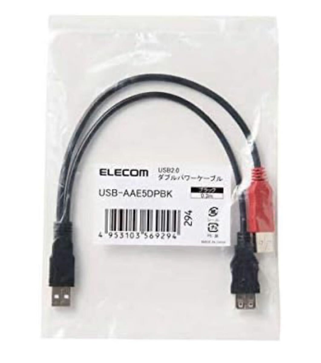 通常のUSB2.0ケーブルに給電用ケーブルがついた、「ダブル給電タイプ」です。