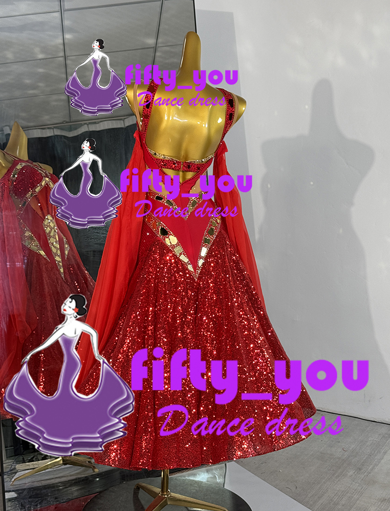新品fifty_you レディース社交ダンスドレス  モダン競技ドレス  サイズオーダー  スタンダードドレス  可愛いキラキラスカート 赤色