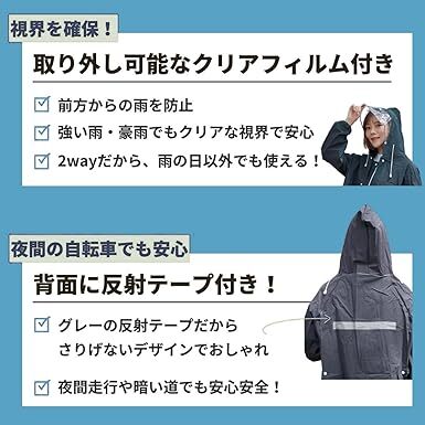 • 【2025新デザイン!3WAYレインコート】自転車、リュックに対応可能な男女兼用のレインコート。2024年の新!3WAYデザインでおしゃれだけでなく実用性も重視!自転車やリュックとの相性も抜群。膝下までしっかりとカバーするロング丈で、体をしっかりと包み込み、レインブーツを履けば足元まで濡れることはありません。背中には反射テープが付いており、夜間走行でもご安心いただけます!大きめサイズでリュックを背負ったままでも十分なゆとりがあります。通勤や通学はもちろん、自転車での移動や雨中作業にも最適であり、台風や梅雨の季節には特に重宝します。