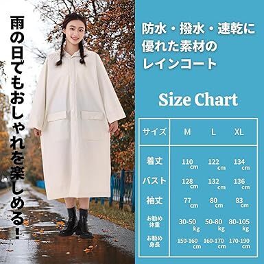 • 【雨の日の憂鬱を吹き飛ばすレインコート!おしゃれだけでなく実用性も重視!】フラップ付きのポケット:携帯電話や鍵など、ちょっとした小物を収納するのに便利です。 ゴム入りの袖口:袖に雨や風が侵入するのを防ぎ、自転車を運転したり雨の日に作業する際に役立ちます。背中に反射テープ付き:車などからの視認性が高まり、雨の夜間でも安全性が向上します。これらの機能は、日常生活での利便性を重視しつつ、デザインと防水性を両立させたものであり、歩行や自転車運転など、さまざまなシーンで便利で快適にご利用いただけます。