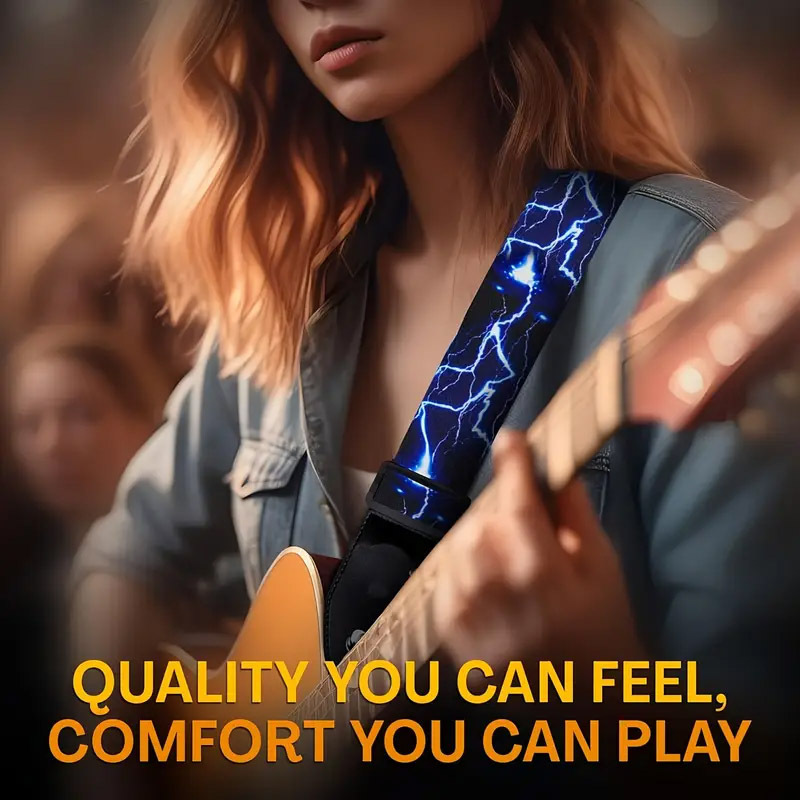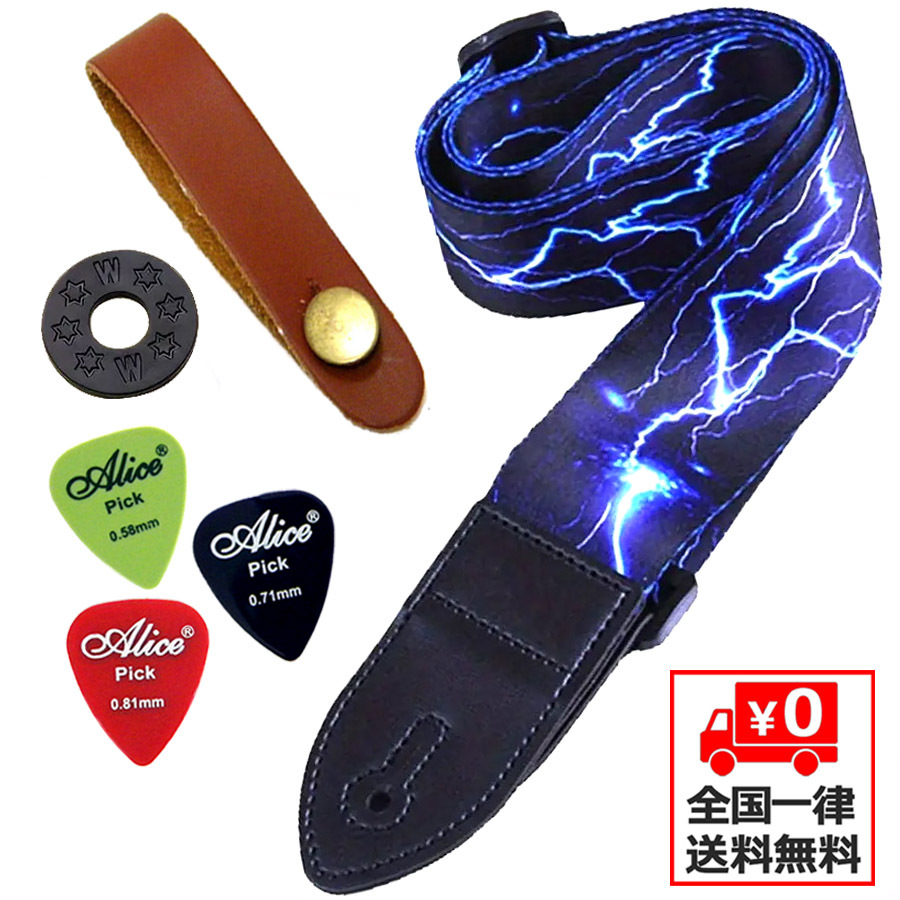 ★ ギター ストラップ (青い稲妻) &ネックホルダー&ストラップロック&ピック(3枚)★4点セット ★