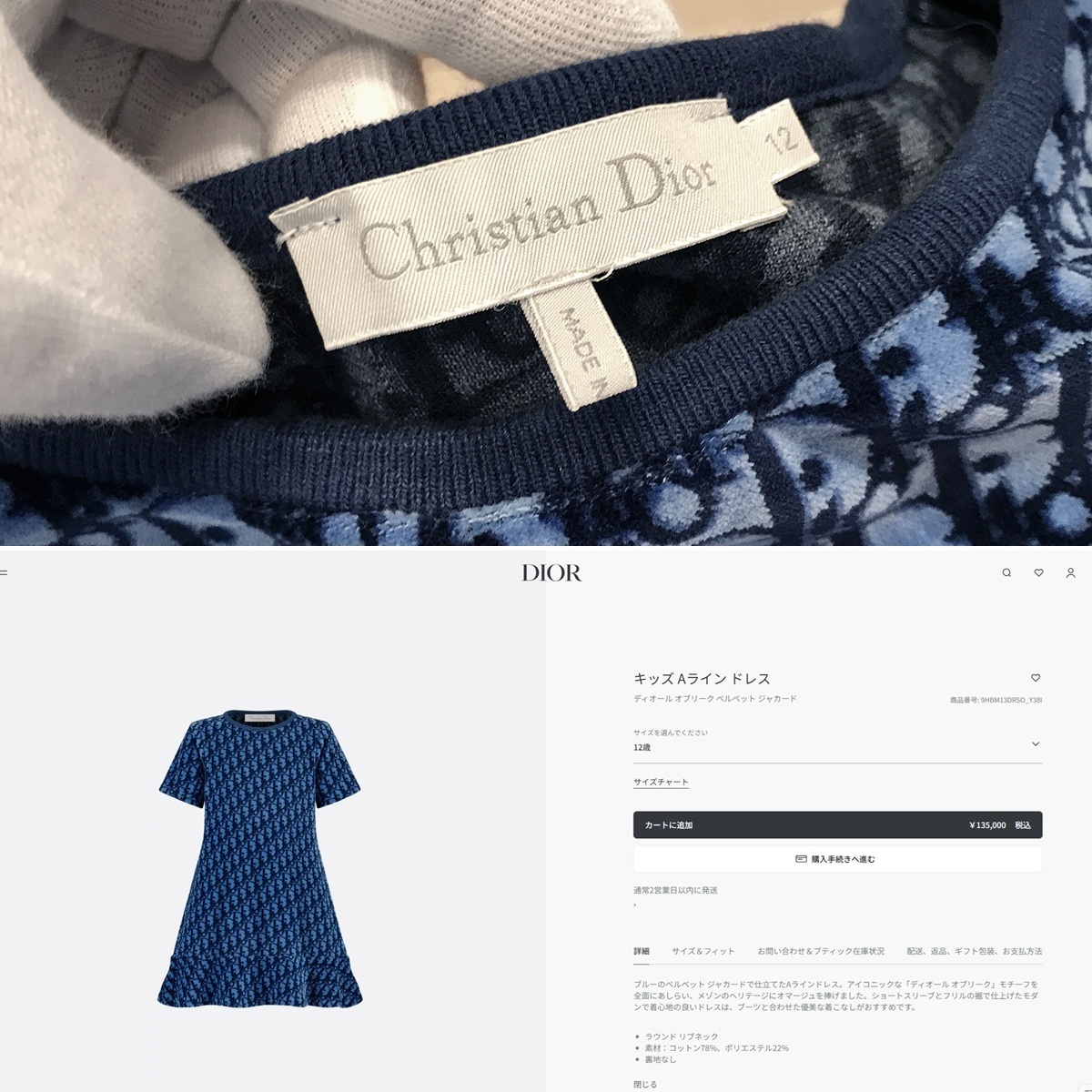 大きなキズ・目立った汚れ・ホツレなどの着用感の少ない非常に良好なコンディションとなっております。キッズサイズですが、小柄な大人の方でもご着用いただけるサイズ感です。2025.04.19.現在ディオール公式ホームページ掲載中の現行商品です。
