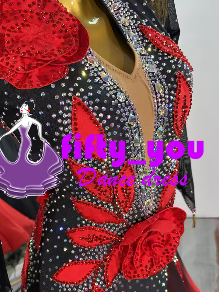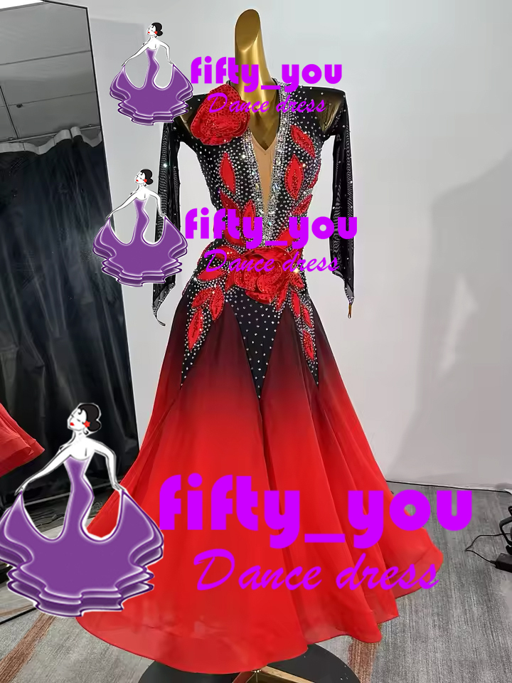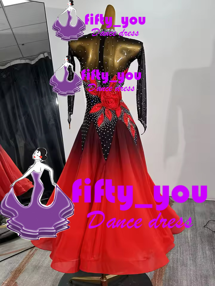 新品fifty_you レディース社交ダンスドレス  モダン競技ドレス  サイズオーダー  スタンダードドレス  立体お花 黒赤グラデーション
