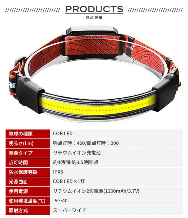 進化版 40個COBLED ヘッドランプ 充電式 前後ライト 警告灯 防水 ヘッドライト 350ルーメン 3モード 210°広角 残量表示 角度調整可 防水 小型 軽量 作業灯 キャンプ