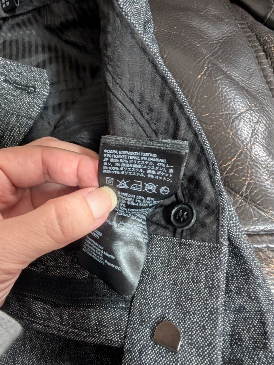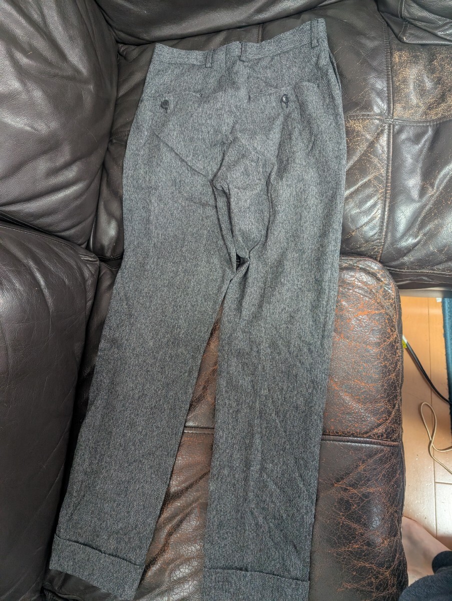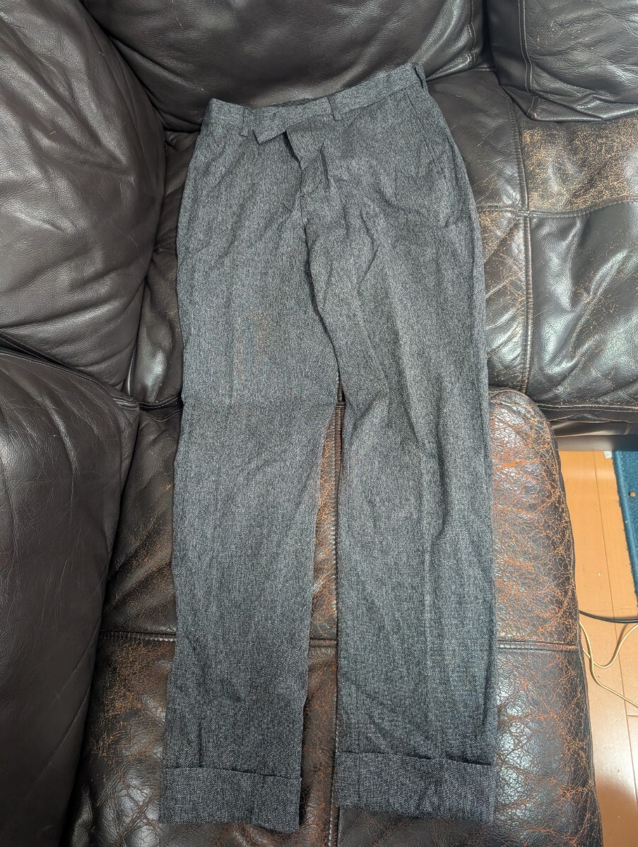 お色はグレー、ツイードの様な生地ですが、素材はポリエステル&レーヨン、裏地もなく今の季節に履くパンツだと思います。
