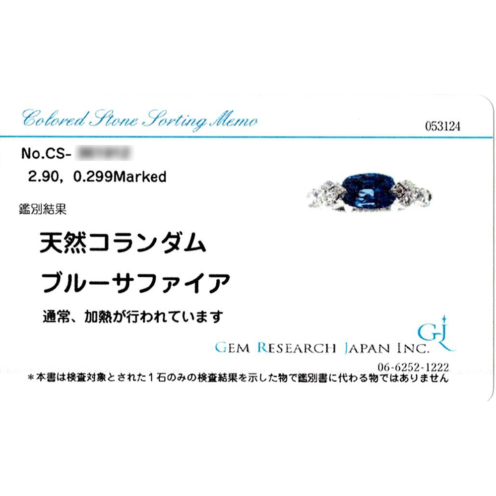 | 商品名 | 非加熱 GIA鑑/GRJソーティング付 Pt900 サファイア 2.9ct ダイヤモンド 0.299ct リング | ||