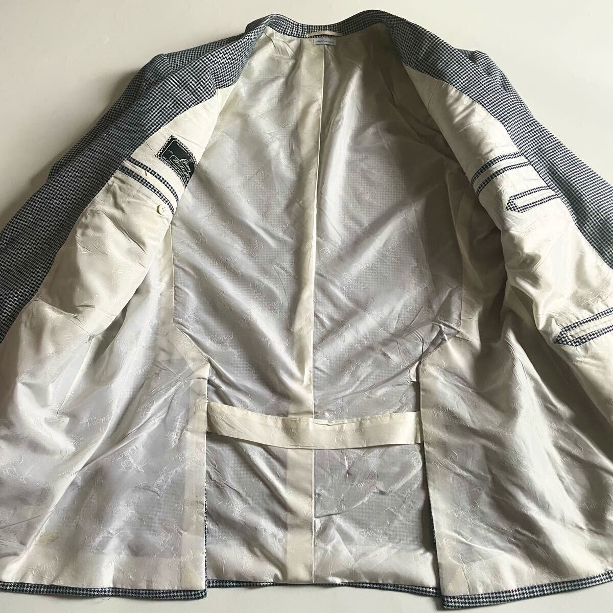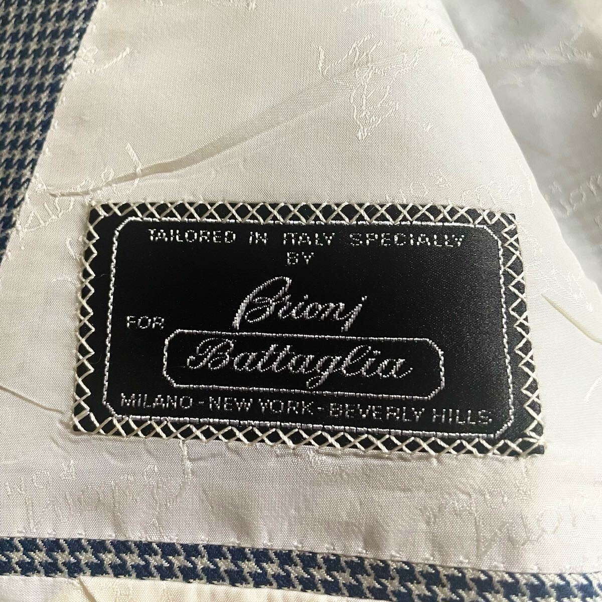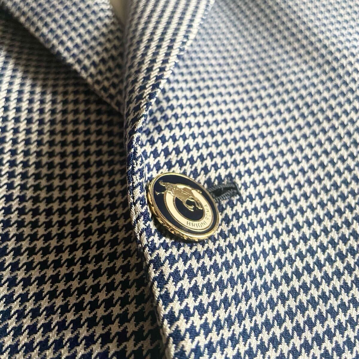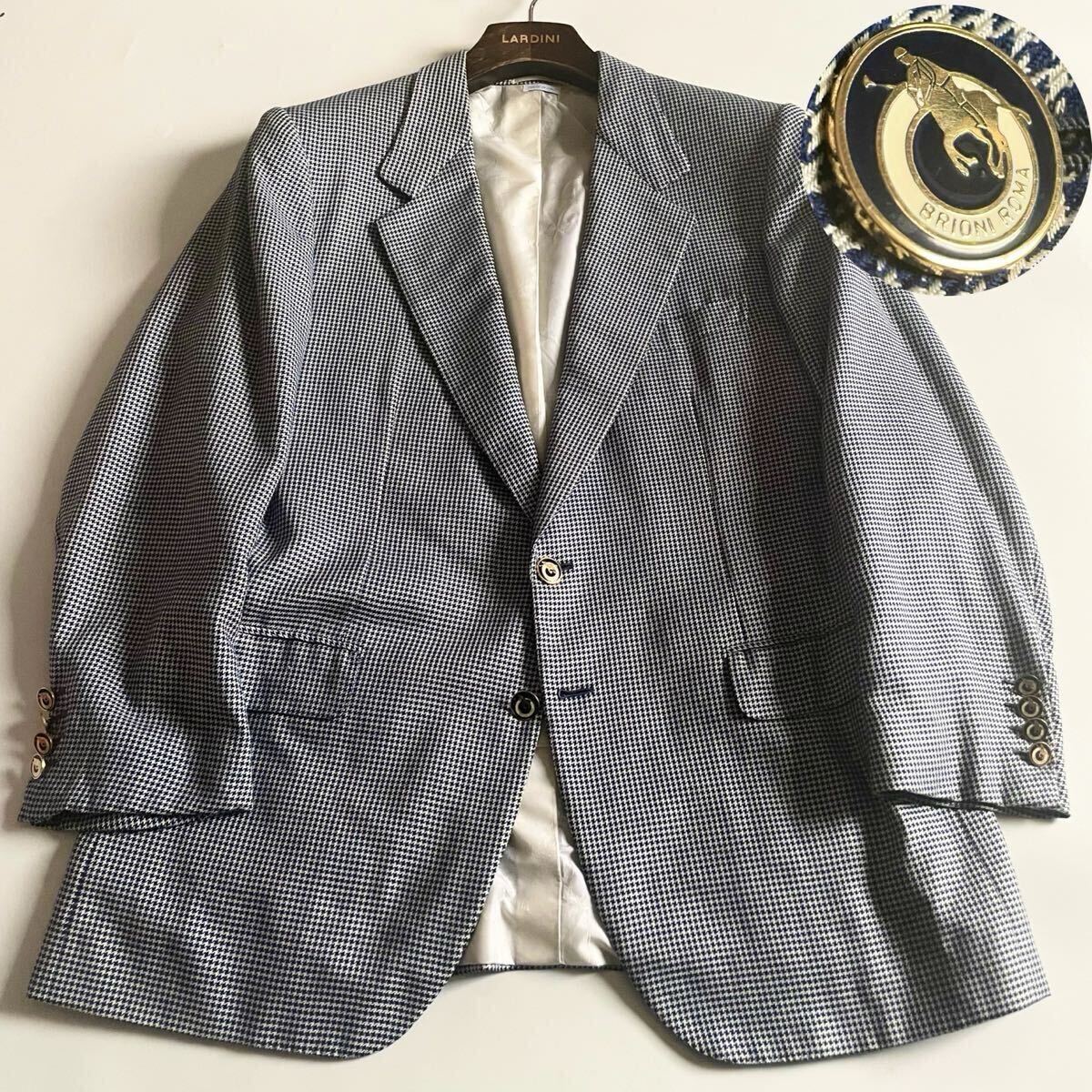 超高級ブティック別注│Brioni/ブリオーニ×Battaglia│シルク素材 千鳥柄 ネイビーブルー│テーラードジャケット 52 ロゴ総柄 イタリア製 ブレザー