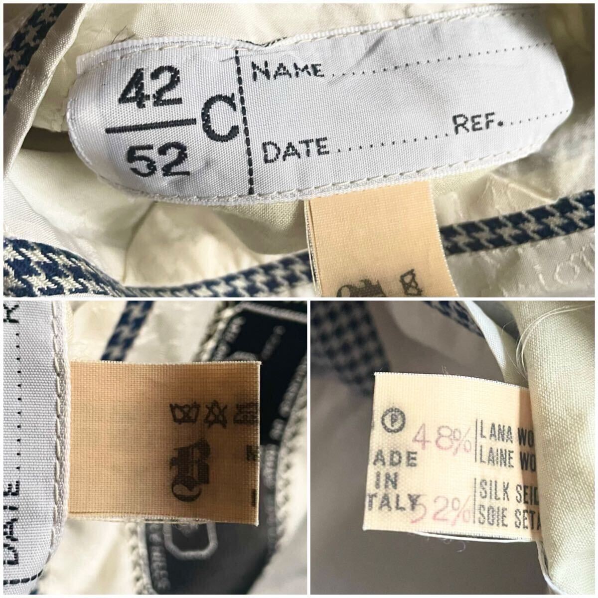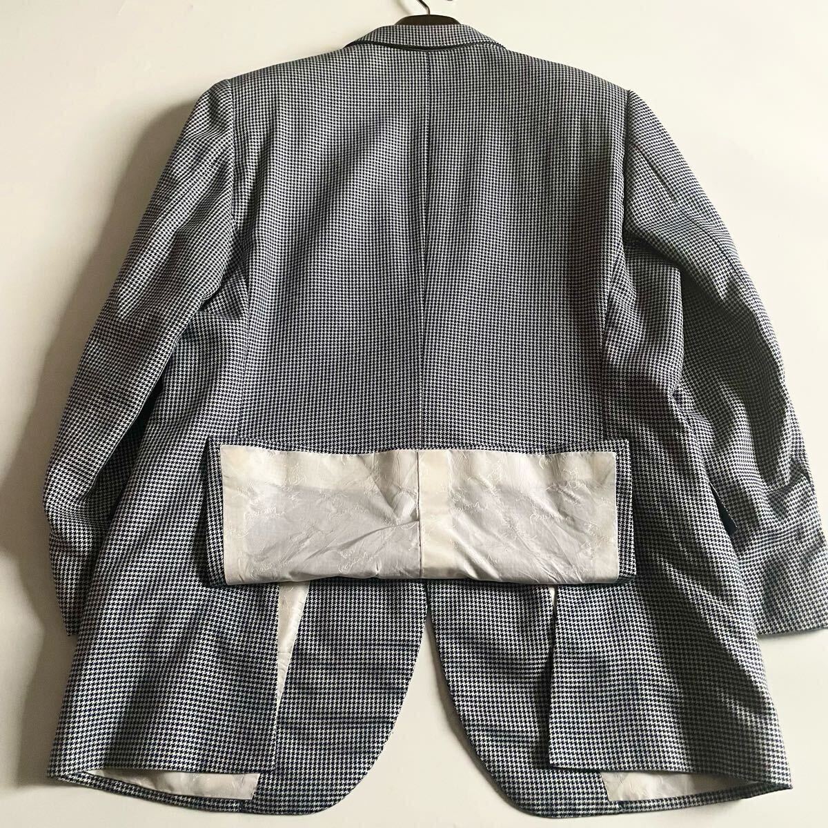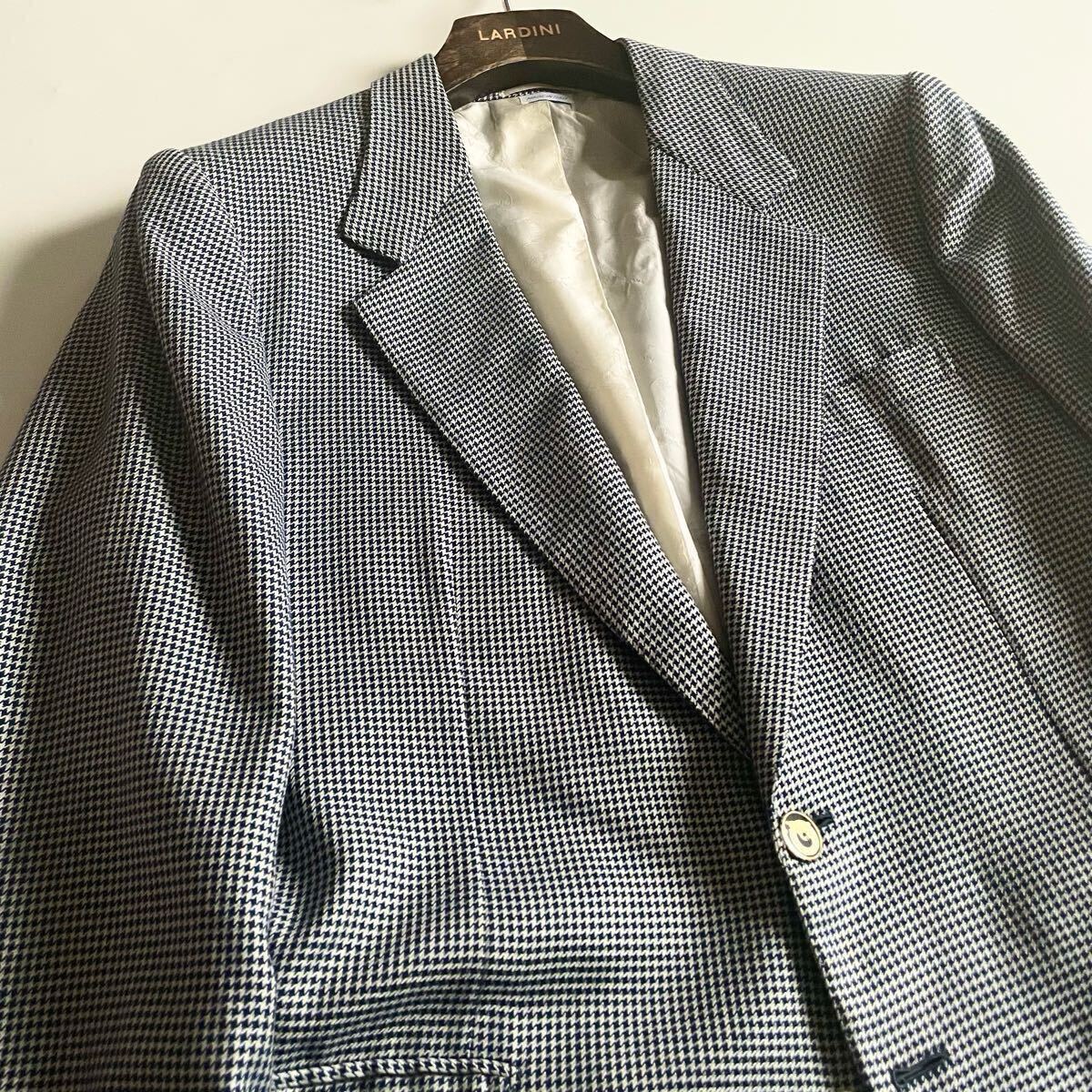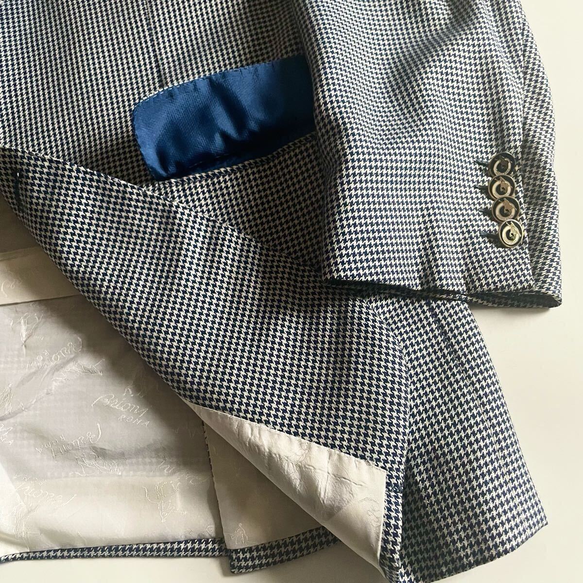 超高級ブティック別注│Brioni/ブリオーニ×Battaglia│シルク素材 千鳥柄 ネイビーブルー│テーラードジャケット 52 ロゴ総柄 イタリア製 ブレザー