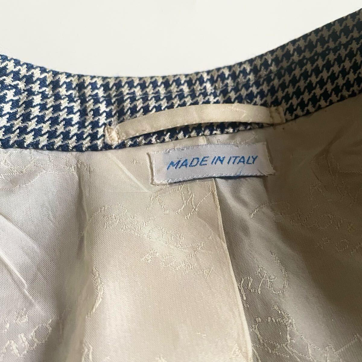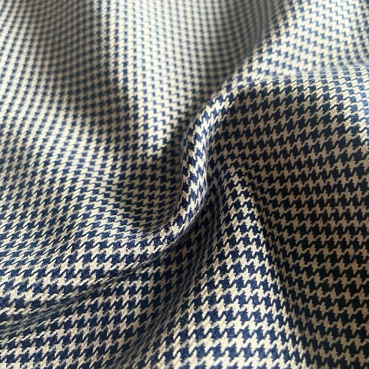 こちらは、「Brioni(ブリオーニ)」と「Battaglia」のコラボレーションによる、超高級ブティック別注の特別なテーラードジャケットです。シルク52%とウール48%の上質な混紡素材を使用し、滑らかな手触りと高級感が際立つ仕上がりとなっています。千鳥柄のデザインがネイビーブルーの生地にエレガンスを添え、唯一無二の存在感を放ちます。