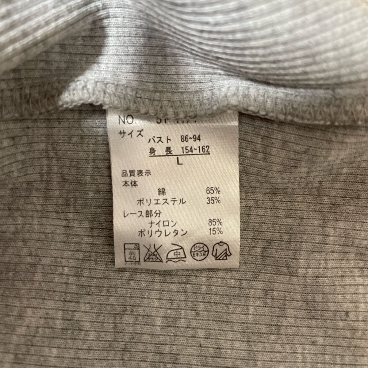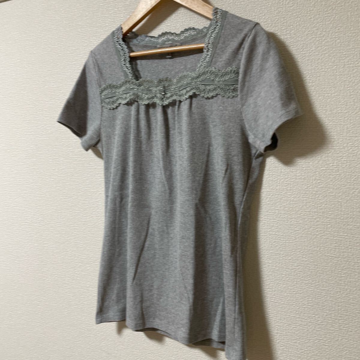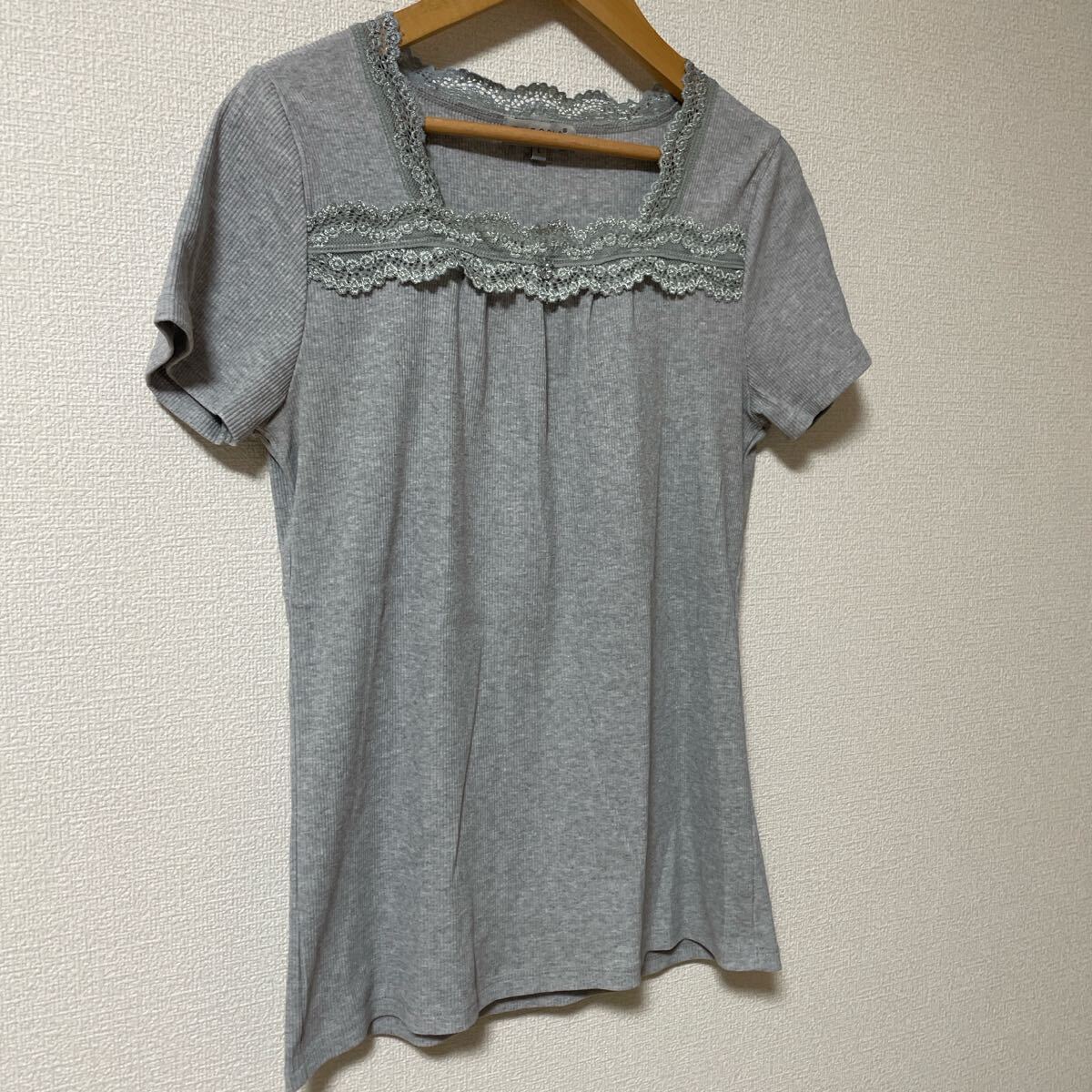 グレーの半袖チュニック、レース装飾付きのスクエアネックデザイン。