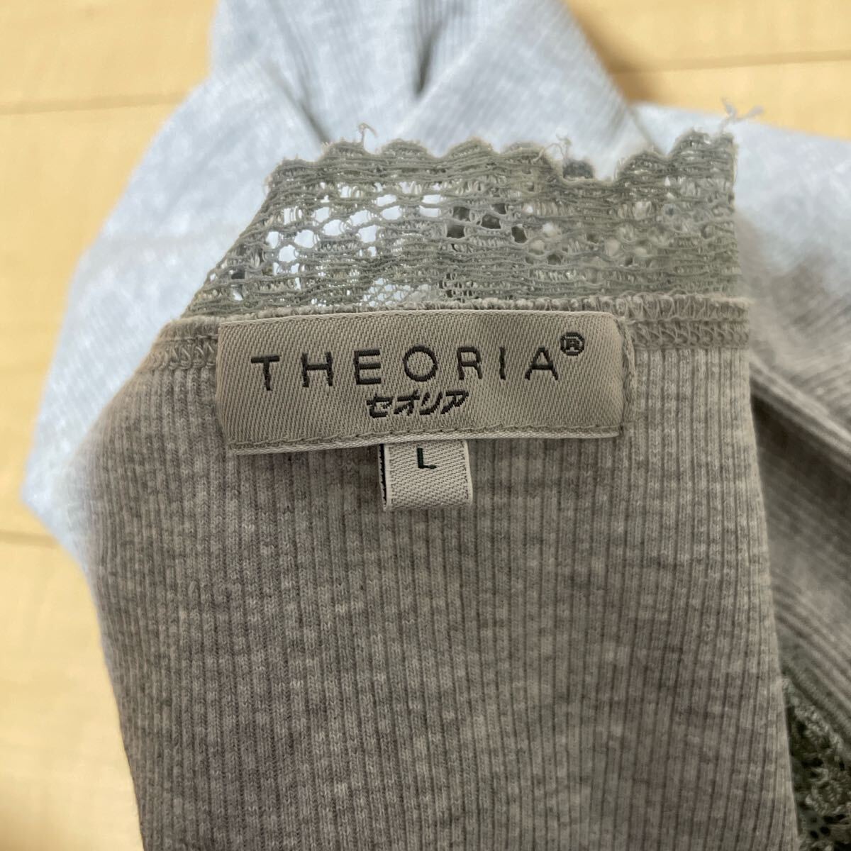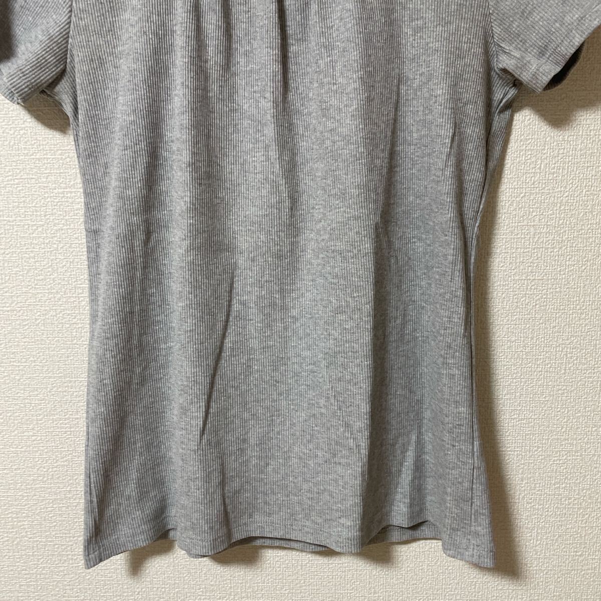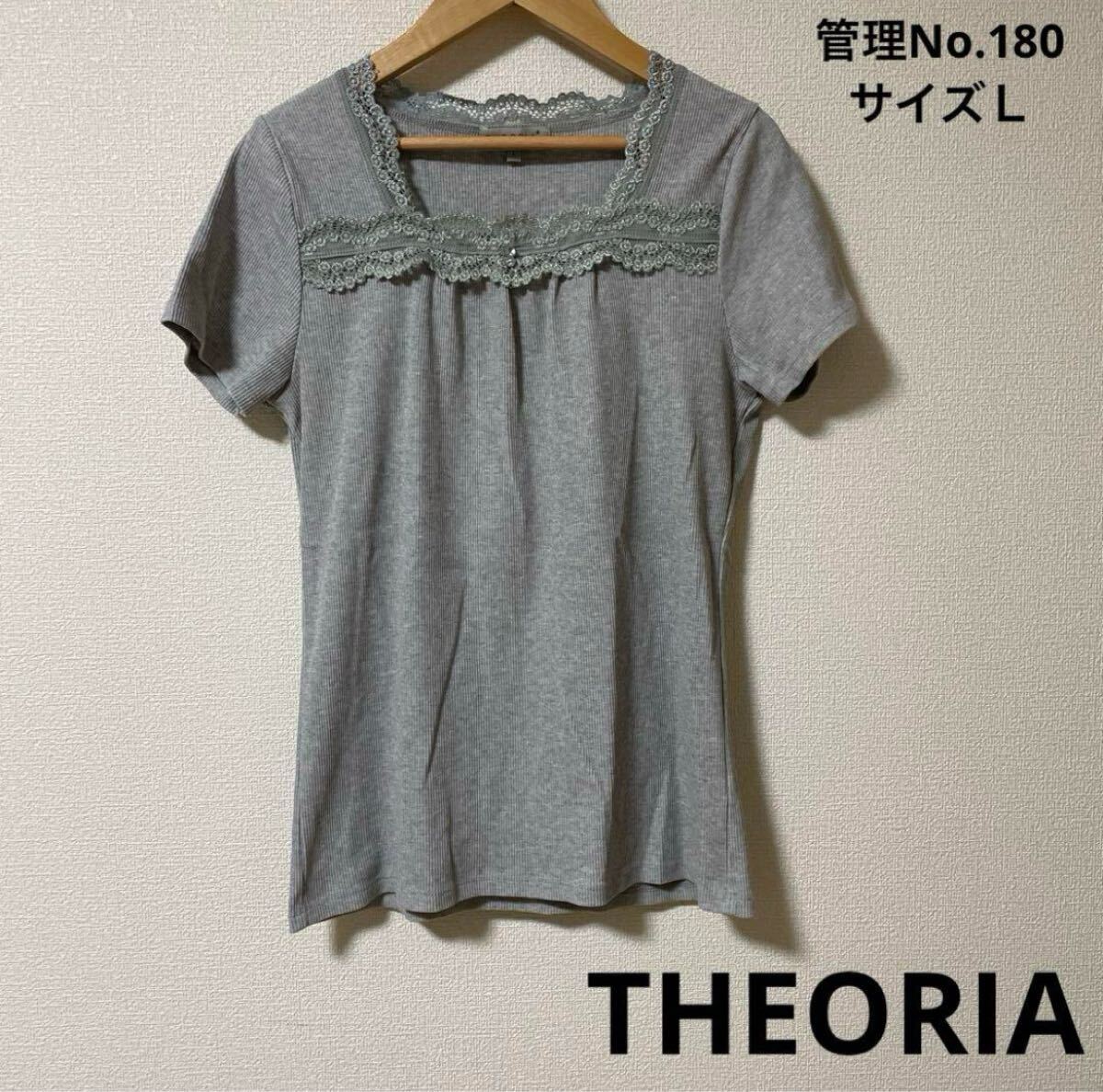 グレーの半袖チュニック、レース装飾付きのスクエアネックデザイン。