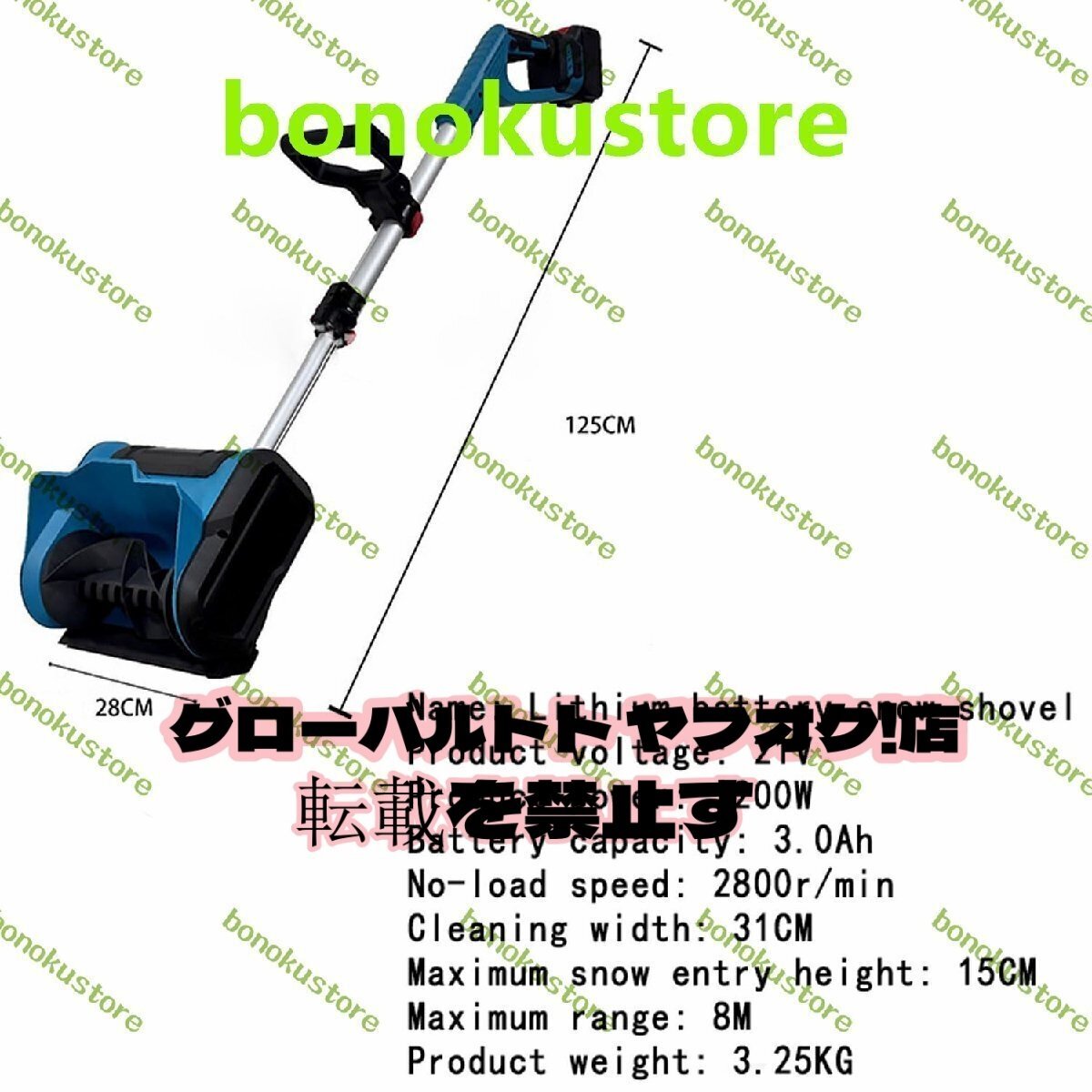 製品名: リチウム電池雪かき 製品電圧: 21V 製品電力: 1200W バッテリー容量:3.0Ah 無負荷速度: 2800r/min クリーニング幅: 31CM 最大積雪高さ: 15CM 最大範囲: 8M 製品重量: 3.25KG