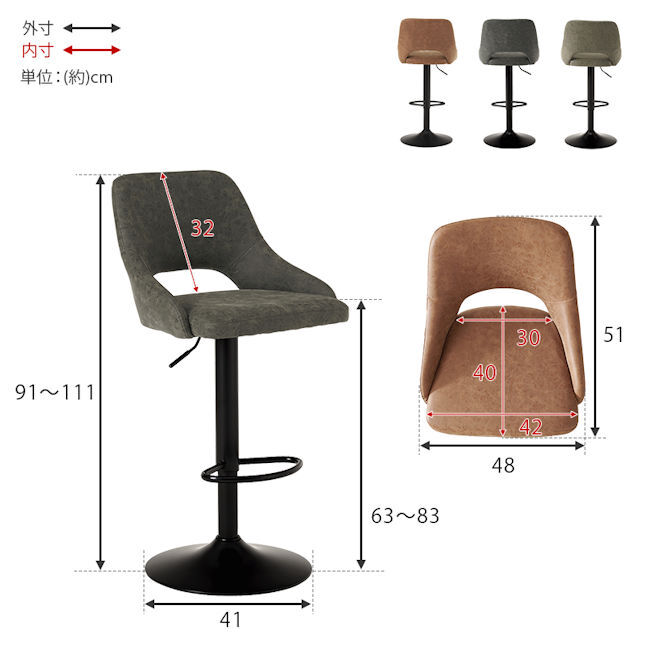 ●【サイズ】(約)幅48x奥行51x高さ90~111x座面高さ63~83cm