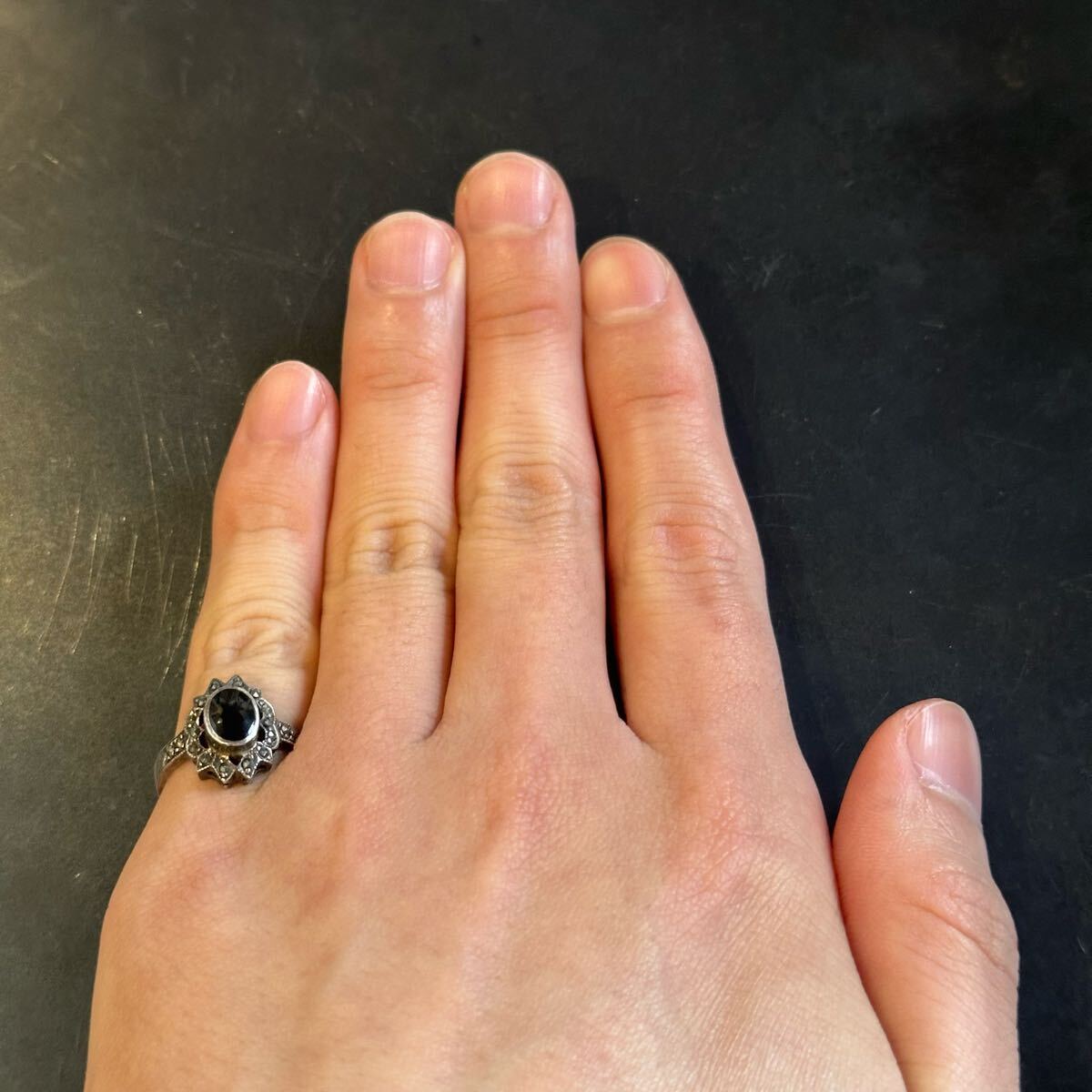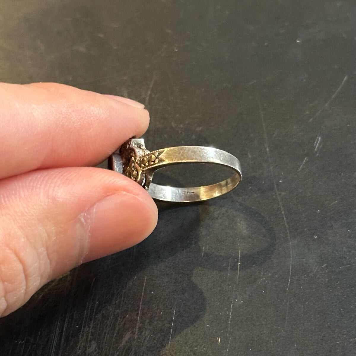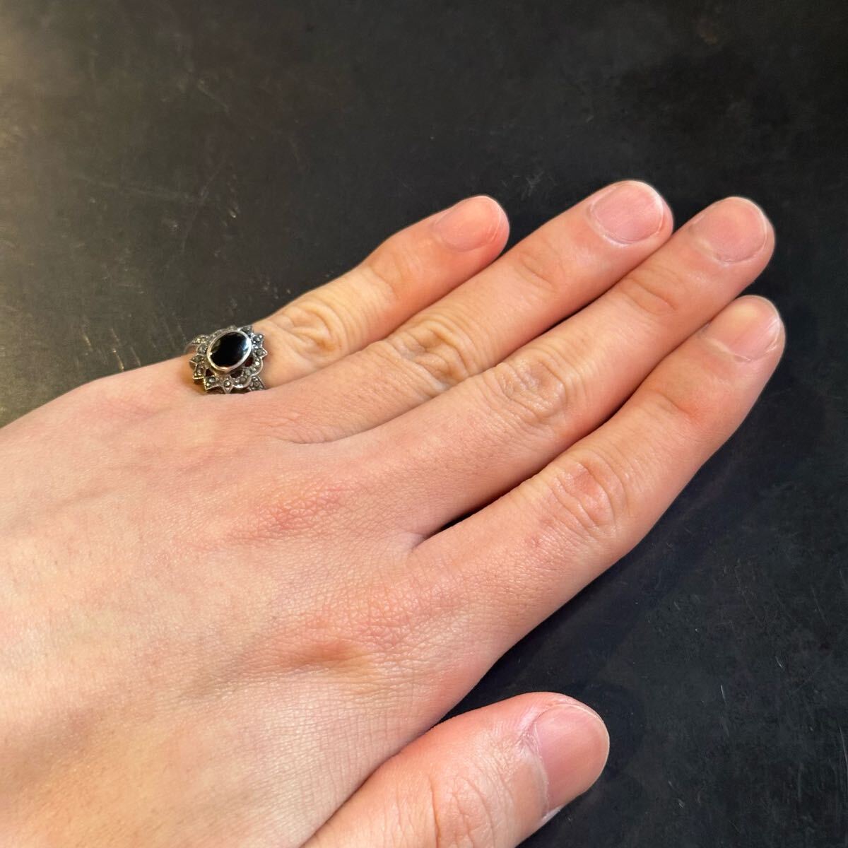 海外で買い付けたオニキスデザインのシルバーリングです。