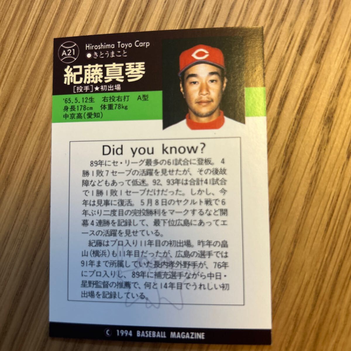 1994BBM A21 紀藤真琴 広島カープ オールスターカード