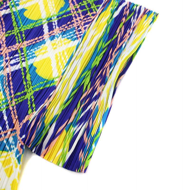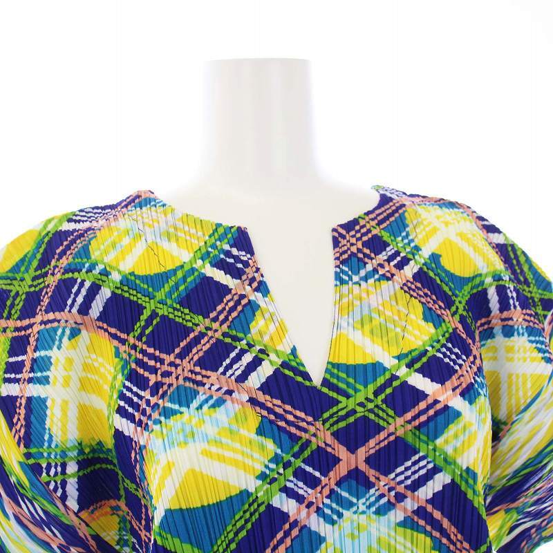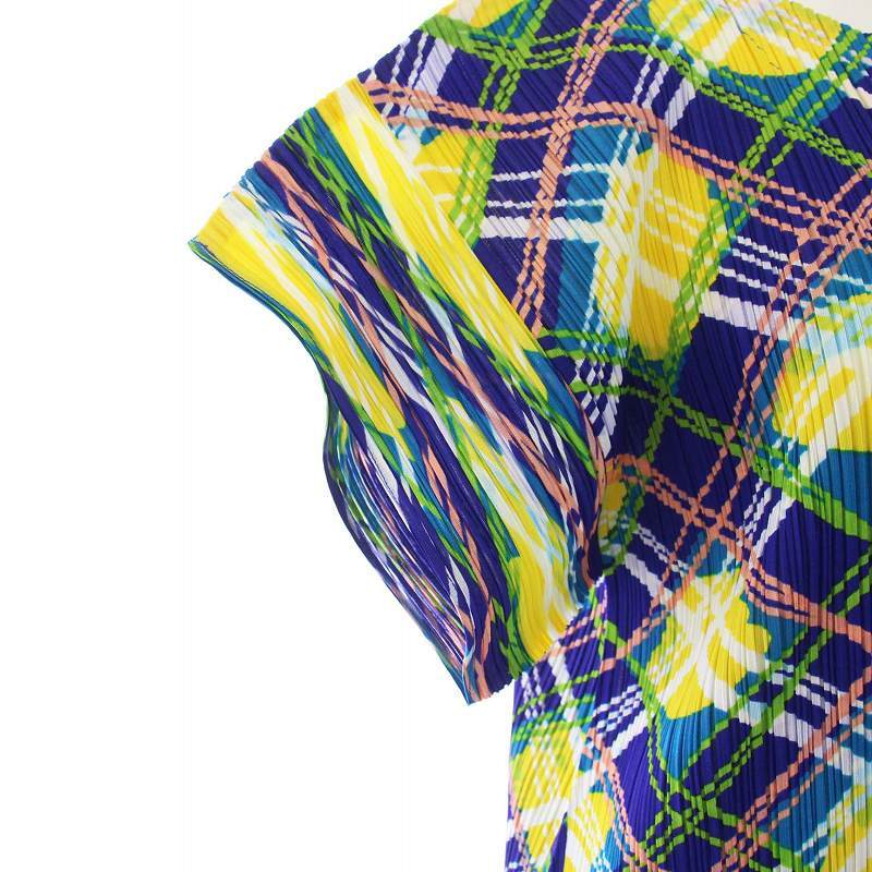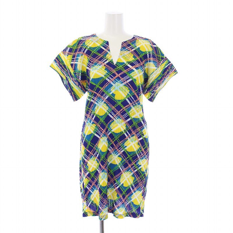 プリーツプリーズ PLEATS PLEASE イッセイミヤケ ワンピース ひざ丈 キーネック 半袖 チュニック チェック柄 総柄 3 L 紺 ネイビー 黄 イエロー /YT レディース