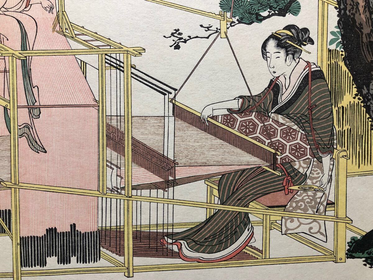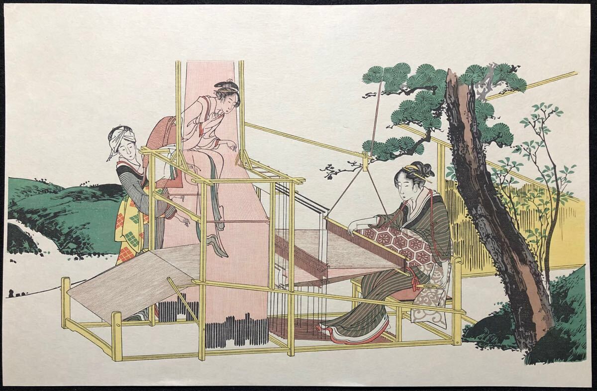 木版画 葛飾北斎【機織り】横大判 アダチ版画研究所 昭和期 復刻版 本物保証 ■ 浮世絵 錦絵 摺物 美人画 Hokusai Ukiyoe。