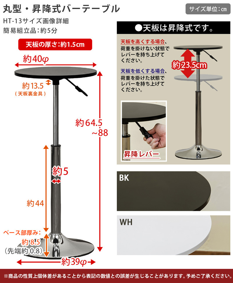 | 商品説明 | 簡易組立品(約5分) お使いのチェアーや座る人に合わせられる昇降式バーテーブル。 どの向きからでも使いやすい丸型で気軽にお部屋を飾れます。 高さ調節で好みのスタイルに合わせられるバーテーブル(40cm幅) 約64,5cm~ハイテーブル88cmとしての高さで ご使用できますので大変便利! 同じ昇降タイプのチェアーに合わせればより快適な過ごし方ができます。 |