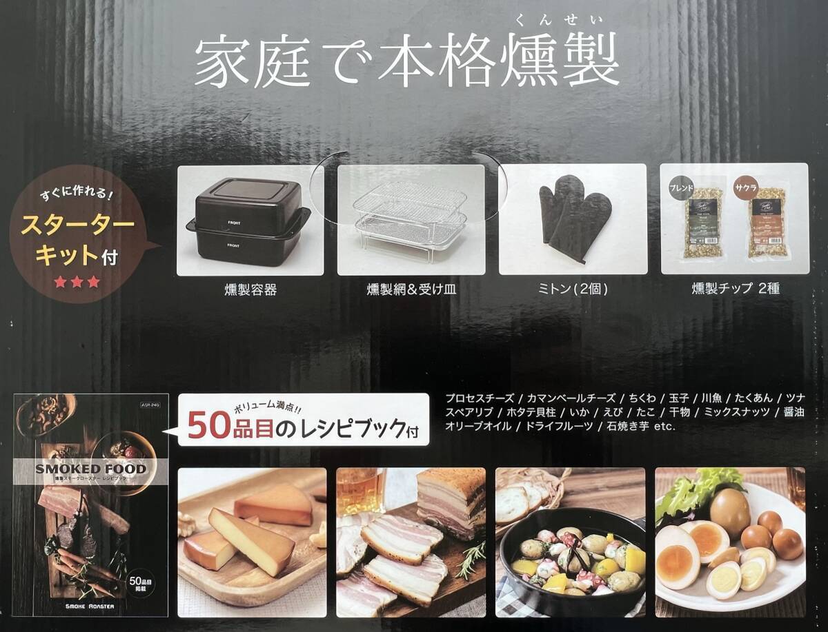 付属品:燻製容器、燻製網、受け皿、ミトン2個、レシピブック、燻製チップ(ブレンド/サクラ)各1袋