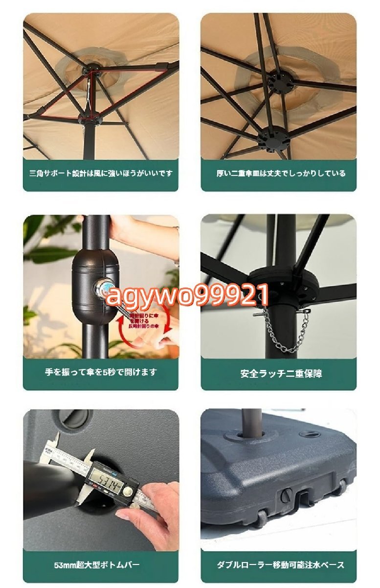 商品の説明私たちは、どんな空間にも美しさを添える高品質なパラソルを作ることに特化しています。私たちのデザイナーとエンジニアが協力して、どんな屋外空間も家族や友人と楽しむ最高の場所に変えてしまう、完璧なパラソルを作り上げます。 スクエアガーデンパラソルのパックです。 パラソル1本 60kg水タンクベース×1 パラソルカバー×1 展開サイズ: 455*265 収納サイズ:140*30 カラー:ベージュ、ブラック、カーキ、バーガンディ、ネイビーブルー、グレー 機能:UVカット、防水、防風。 注意事項 ベースとパラソルは別々に梱包され、発送されます。