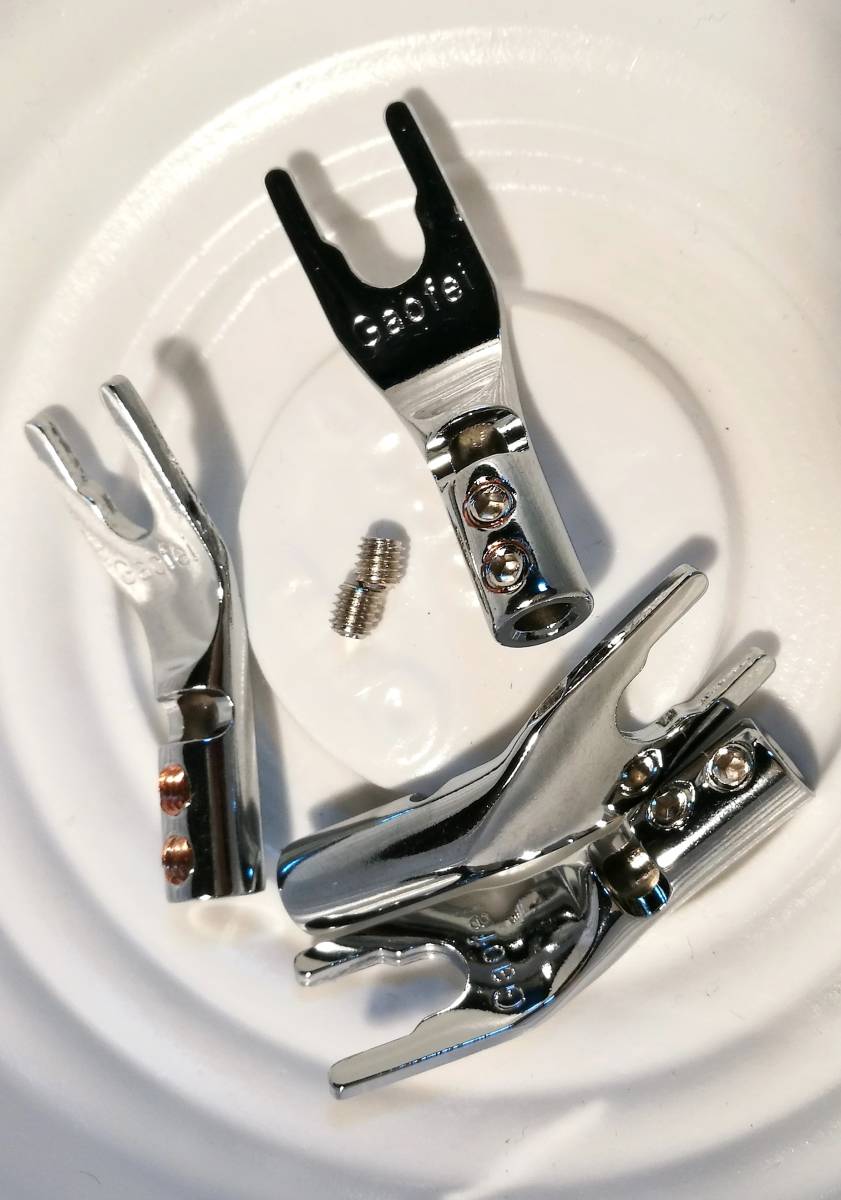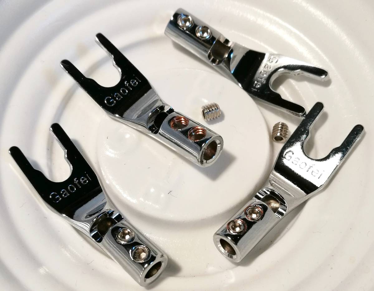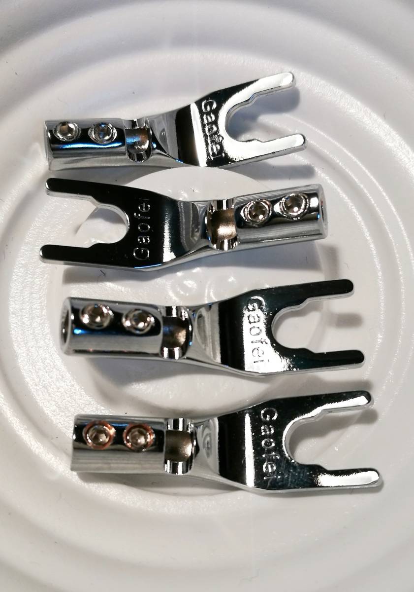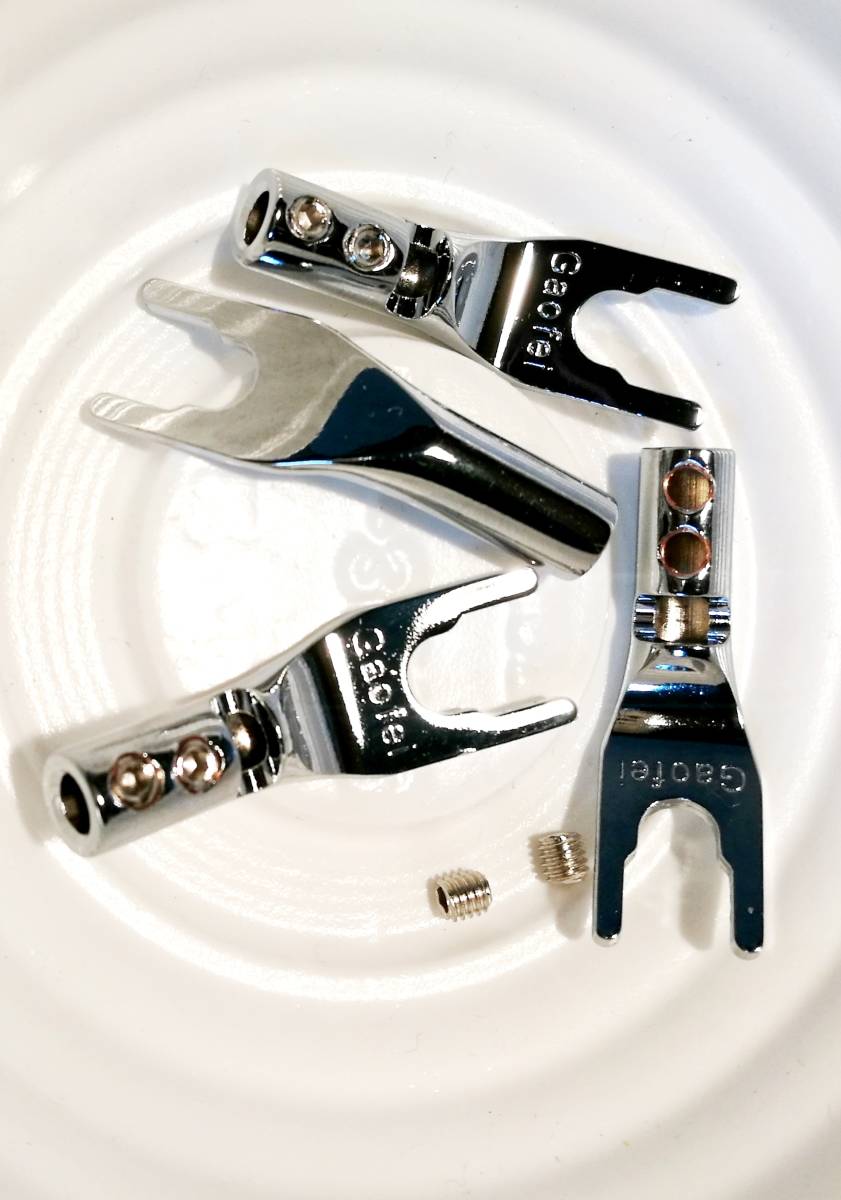 ①純銅パイプを成形加工後にロジウムメッキ処理をした美しい高級Yラグで、ほとんどの端子に接続可能です。