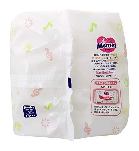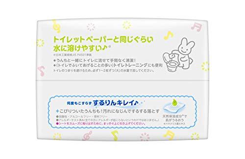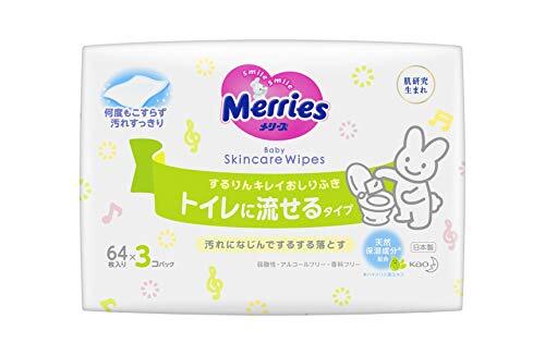 「【おしりふき 流せるタイプ】メリーズ するりんキレイ (トイレに流せる) 64枚×3パック」▼4901301239860▼(商品説明)・ 64枚×3コ(つめかえ) ・・Size:64枚×3コ(つめかえ)・【流せるおしりふき】うんちと一緒にトイレにポイ。おむつ替えの後始末の手間をぐっと減らせます。トイレで拭いてあげることの多い、トイレトレーニングのときも、すぐに流せて便利です。・【肌研究生まれのおしりふき】するする拭き取りローションで、やわらかうんちも、こびりついたうんちもすばやくなじんでするっとふき取れる。・【天然保湿成分※配合】※ハマメリス葉エキス配合。ふいた後もお肌がうるおいます。・弱酸性、アルコールフリー、無香料。新生児から使えます。日本製。手や体にも使えます。・【内容量】64枚×3パック(192枚)【商品サイズ】 (幅×奥行×高さ) :178×120×380mm説明 商品紹介 「うんちキャッチゾーン」が付いたふんわり厚手シートで、生まれたての赤ちゃんに多いやわらかうんちも、何度もこすらずするりんキレイ。シートの細かなくぼみに、汚れを取り込みながら落とします。また、「するするふき取りローション」入りで、しつこいうんち汚れにすばやくなじんで、するするスムーズに落とせます。何度もこすらないから、赤ちゃんの肌に負担をかけません。 素肌と同じ弱酸性。 無香料、ノンアルコール。 手や体にも使えます。 シートはトイレに流せます。 ※つまりを避けるため、必ず1~2枚ずつ流してください。 使用上の注意 ●傷やはれもの、湿疹等異常のあるところには使わない。 ●肌に異常が生じていないかよく注意して使う。肌に合わない時や、使用中、赤み、はれ、かゆみ、刺激、色抜け(白斑等)や黒ずみ等の異常が出た時、また日光があたって同じような異常が出た時は使用を中止し、皮フ科医へ相談する。使い続けると症状が悪化することがある。 ●誤食に注意する。 )応急処置SOS ●乳幼児の手の届かない所に保管する。 ●眼をふかない。 ●シートは水に溶けないので、トイレに流さない。 ●家具や床などをふいたり、シートを放置したりしない。 ●シートの乾燥を防ぐため、使用後はフタをきちんと閉める。 ●日の当たる所や、高温の所には保管しない。 [応急処置] 水で口に残ったものをすすいでから、コップ1~2杯の水か牛乳を飲んでください。 牛乳には、胃壁を保護し、成分の影響を弱める働きがありますので、あれば牛乳を飲むほうが的です。 また、飲んだものを無理に吐き出そうとしないでください。嘔吐物が気管に入って、窒息や誤嚥性肺炎(ごえんせいはいえん:左の説明参照)をおこす可能性があり、危険です。 ●少量の原液や使用濃度に溶かした液を飲んだ場合 応急処置後、異常があれば、飲んだ製品を持って医師の診察を受けてください。 少量の誤飲・誤食でも、すみやかに受診する必要がある製品もありますので、下記の日本中毒情報センターのホームページも併せてごらんください。 ●原液をそのまま、多量に飲んだ場合 応急処置後、飲んだ製品を持ってすみやかに医師の診察を受けてください 飲んだ直後に症状がなくても、経過を観察し、いつもと様子が異なる場合は、医師の診察を受けてください。 商品に関するお問合せ・ご意見は「花王者相談室」0120-165-695 受付時間:9:00~17:00(土・日・祝日は除く) ご注意(免責)>必ずお読みください 【商品について】 ・予告なくリニューアル等により商品及びパッケージ仕様・処方等が変更になる場合がございます。 【画像についてのお断り】 ・画像および画面の性質上、実際のカラーとは異なる場合がございます。予めご了承願います。 ・お肌に合わないときは、ご使用をおやめください。 ・使用中や使用後に赤味、はれ、かゆみ、刺激等の異常があらわれた時は直ちに使用を中止し、皮膚科専門医等へのご相談をおすすめします。 ・乳幼児の手の届かないところに保管して下さい。