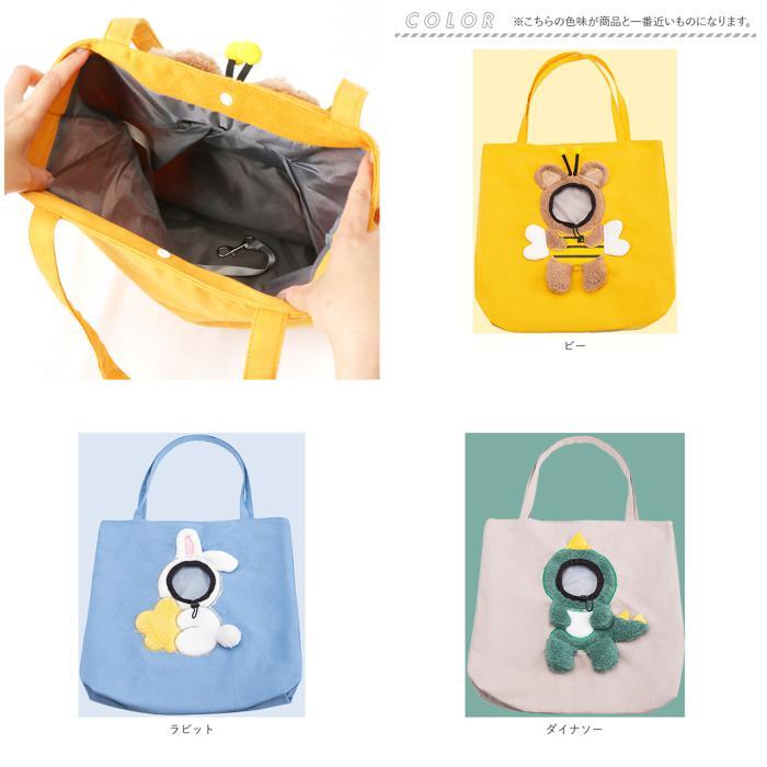 商品説明 | ・・ぴょこんとお顔を出して、キュートな着ぐるみに変身!ワンちゃん・ネコちゃんと気軽にお出掛けできる「トートバッグ型ペットキャリー」が新登場。 ・【みんなが笑顔になるデザイン】 ・バッグ前面にアニマルや恐竜の着ぐるみを立体的にあしらった個性的なデザイン。ペットがお顔を出したら、すれ違う人も思わず笑顔に♪ ・【ペットがくつろげる素材感】 ・バッグの表生地は、ペットが丸くなってくつろげるくたっと柔らかなキャンバス生地を使用。程よく通気性を保ち、熱がこもりにくいつくり。 ・【首回りにぴったりフィット】 ・お顔を出す丸い小窓は、長さ調節のできるドローコードで首回りにぴったりフィット!ネコちゃんが手を出して引っかく心配のない安心仕様。 ・【飛び出し防止ストラップ】 ・開口部のスナップボタンをパチンッと閉めて、フック付きコードをペットの首輪につなぐことで、急な飛び出しを防止! ・【長めの持ち手ハンドル】 ・バッグのハンドルは肩掛けにしやすいよう長めにデザインし、移動時の飼い主さんへの負担も優しく軽減。 ・【見た目の可愛さだけじゃない♪】 ・ペットが外の様子を眺めたり、飼い主さんの存在を身近に感じることができるので、ストレスを受けやすいお出掛け中もリラックス。 ・【ご家庭で簡単お洗濯】 ・汚れが気になったら、手洗いでお洗濯が可能。お洗濯後は小さく折りたたんで、持ち運びにも便利なサイズ。 ・【お出掛けをもっと快適に!】 ・お散歩の途中でワンちゃんが疲れてしまったとき、ケージ型のペットキャリーを嫌がるネコちゃんを動物病院に連れていくときなどに大活躍!(※推奨体重・・・体重3.5kg程度のネコちゃん、体重4.5kg程度までの小型犬用のペットバッグです。) |