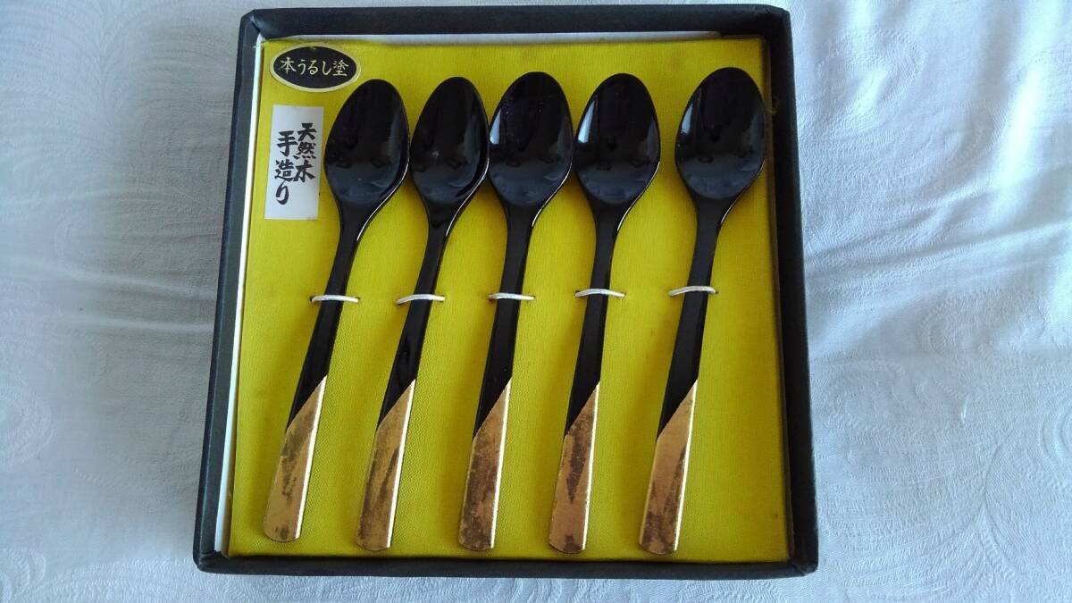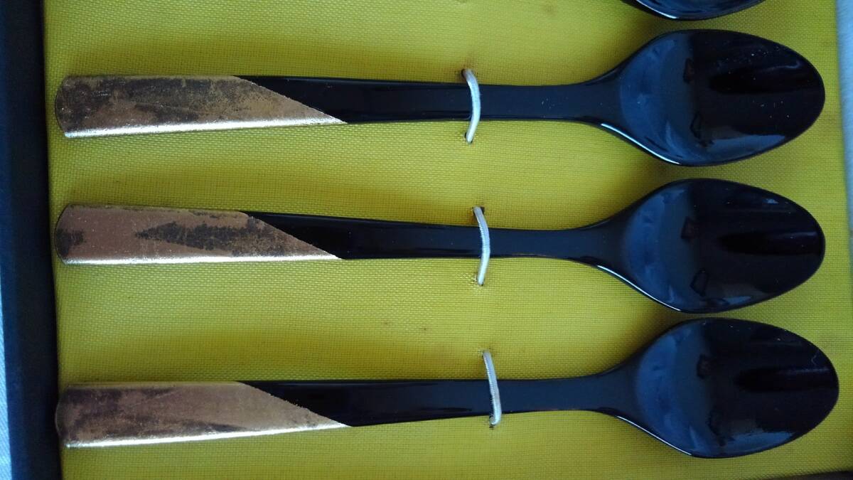 ◆伊勢丹特選◆手づくり木製漆器◆本うるし塗◆天然木手造り◆黒コーヒースプーン金箔◆5本セット◆