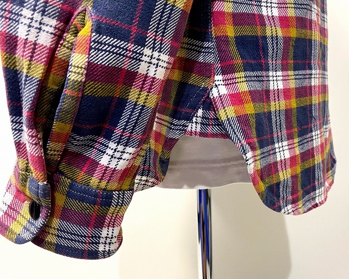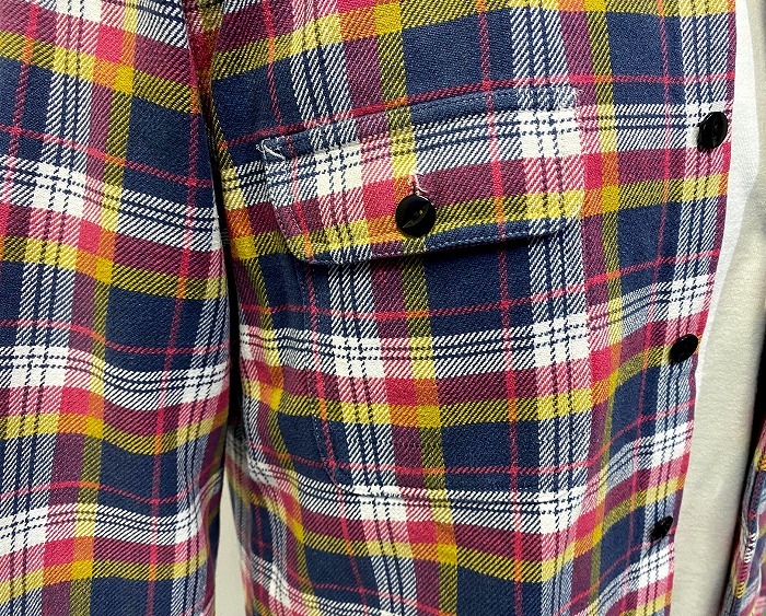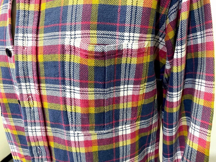 ・素材:コットン100% ・カラー: マルチ ・サイズ: L 実寸 肩幅 約48cm・身幅 約57.5cm・着丈後ろ 約76cm・袖丈 約67cm (多少の誤差はお許しください) 目が詰まった厚手のフランネル生地は、ヴィンテージのフランネル生地の若干の織りムラ ピリング感までもリアルに再現されており、着込むほどに風合いが増していく楽しみもあります。 フロントには、フラップポケットとペン差し用のステッチポケットを配置。 猫目(ネコメ)ボタン。 裾のサイドはマチつき。 さりげないコダワリのディテールも魅力です。 着こなしに変化をつけるために、チェック柄は着こなしのアクセントになってくれます。 ベーシックな1枚でジーンズでもチノパンでも、ボトムスを選ばない万能的な一枚。 目立つ傷み汚れなし。 インド製 かなりお値打ちだと思います。この機会にぜひ!。 他にもいろいろ出品しています。 管理番号:012505Y-090283 N3下★ |