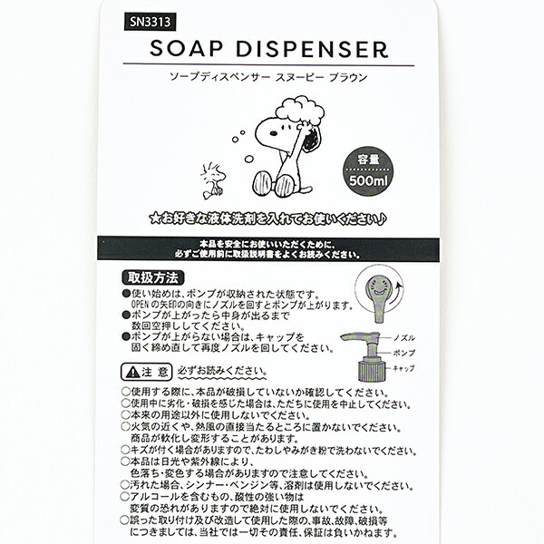 | 商品説明 | スヌーピーのソープディスペンサーです。シンプルながらオシャレなデザインなのでどんなお風呂にも馴染みます♪お好きな液体洗剤を入れてお使いください☆【容量:500ml】 |