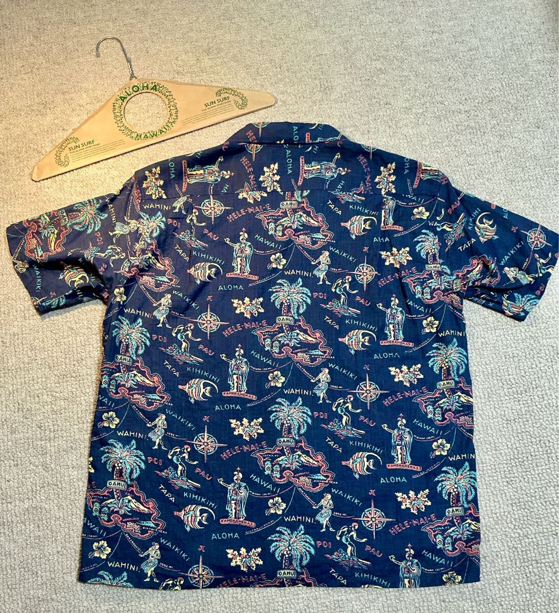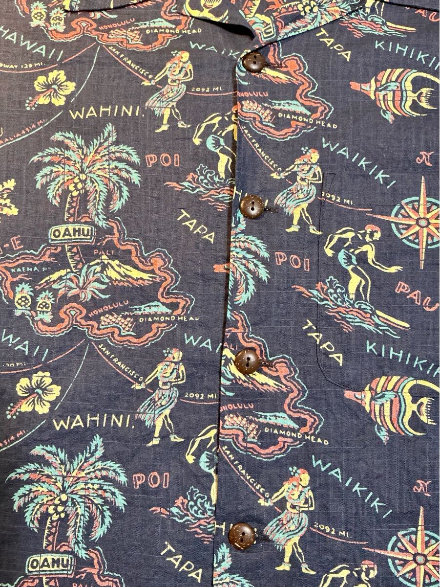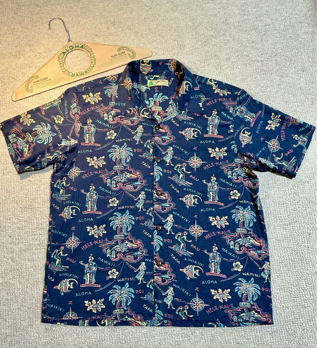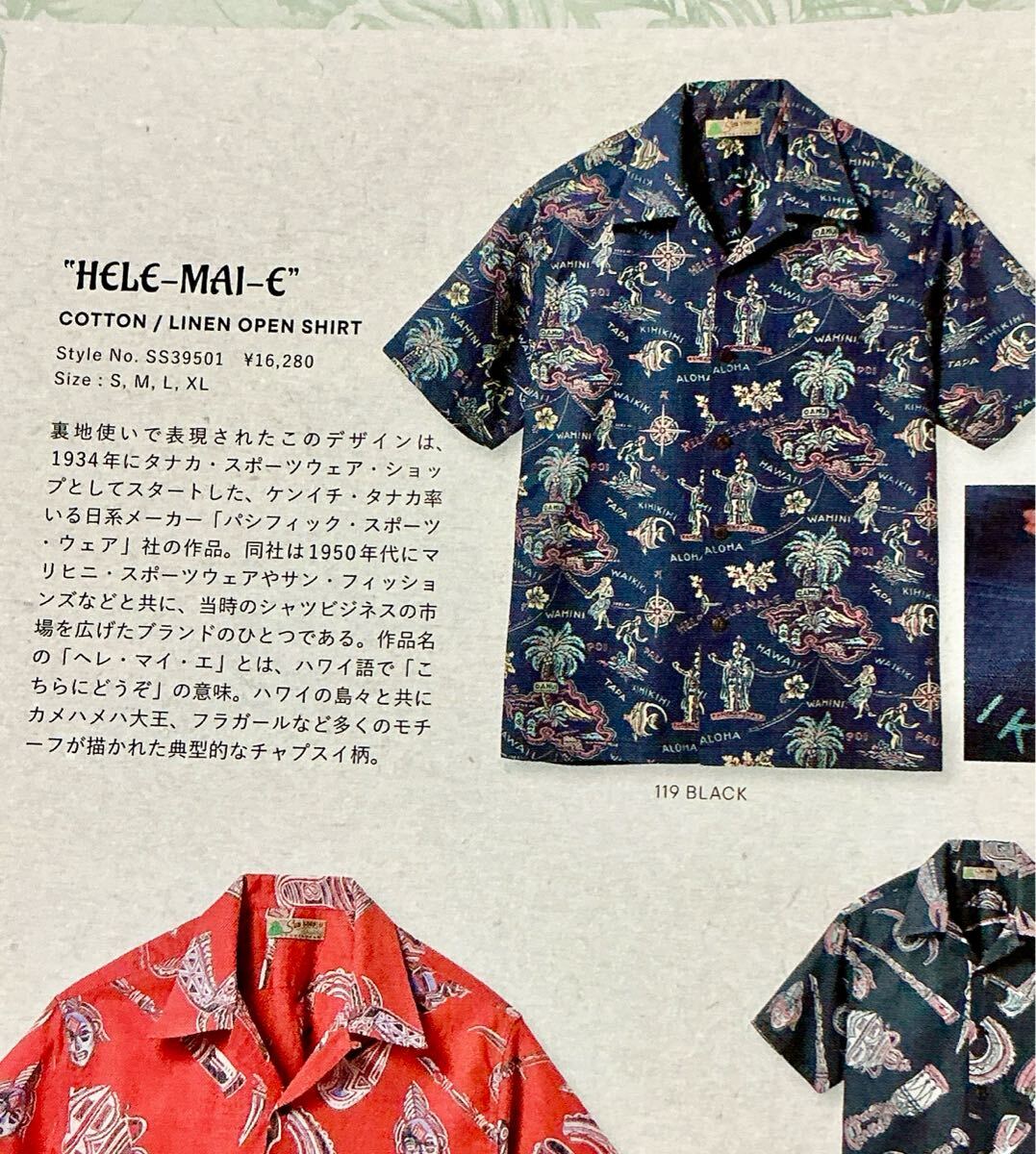 同社は1950 年代にマリヒニ・スポーツウェアやサン・フィッションズなどと共に、時のシャツビジネスの市場を広げたブランドのひとつである。作品名の「ヘレ・マイ・エ」とは、ハワイ語で「こちらにどうぞ」の意味。ハワイの島々と共にカメハメハ大王、フラガールなど多くのモチーフが描かれた典型的なチャプスイ柄。