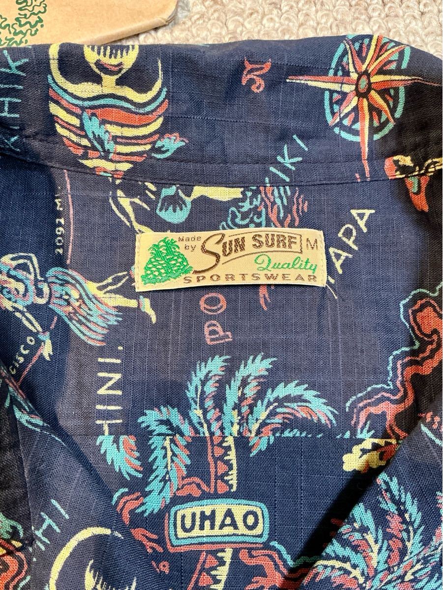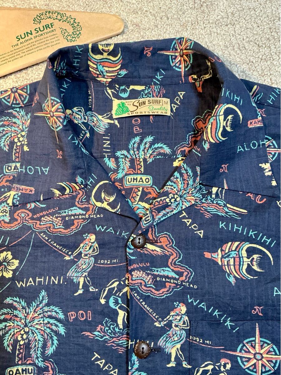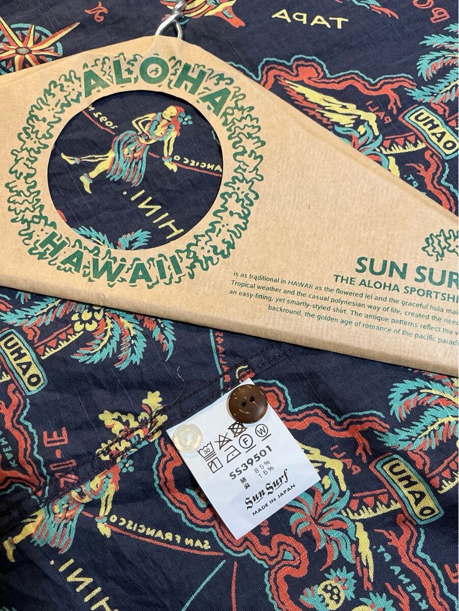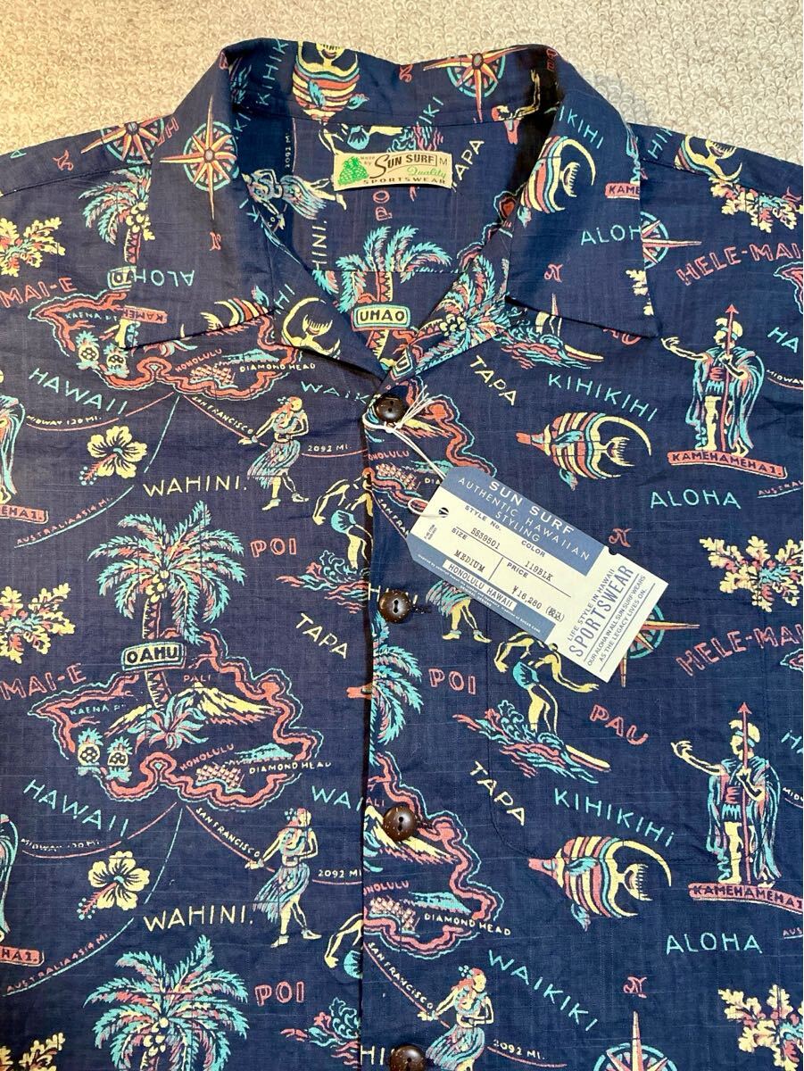 同社は1950 年代にマリヒニ・スポーツウェアやサン・フィッションズなどと共に、時のシャツビジネスの市場を広げたブランドのひとつである。作品名の「ヘレ・マイ・エ」とは、ハワイ語で「こちらにどうぞ」の意味。ハワイの島々と共にカメハメハ大王、フラガールなど多くのモチーフが描かれた典型的なチャプスイ柄。