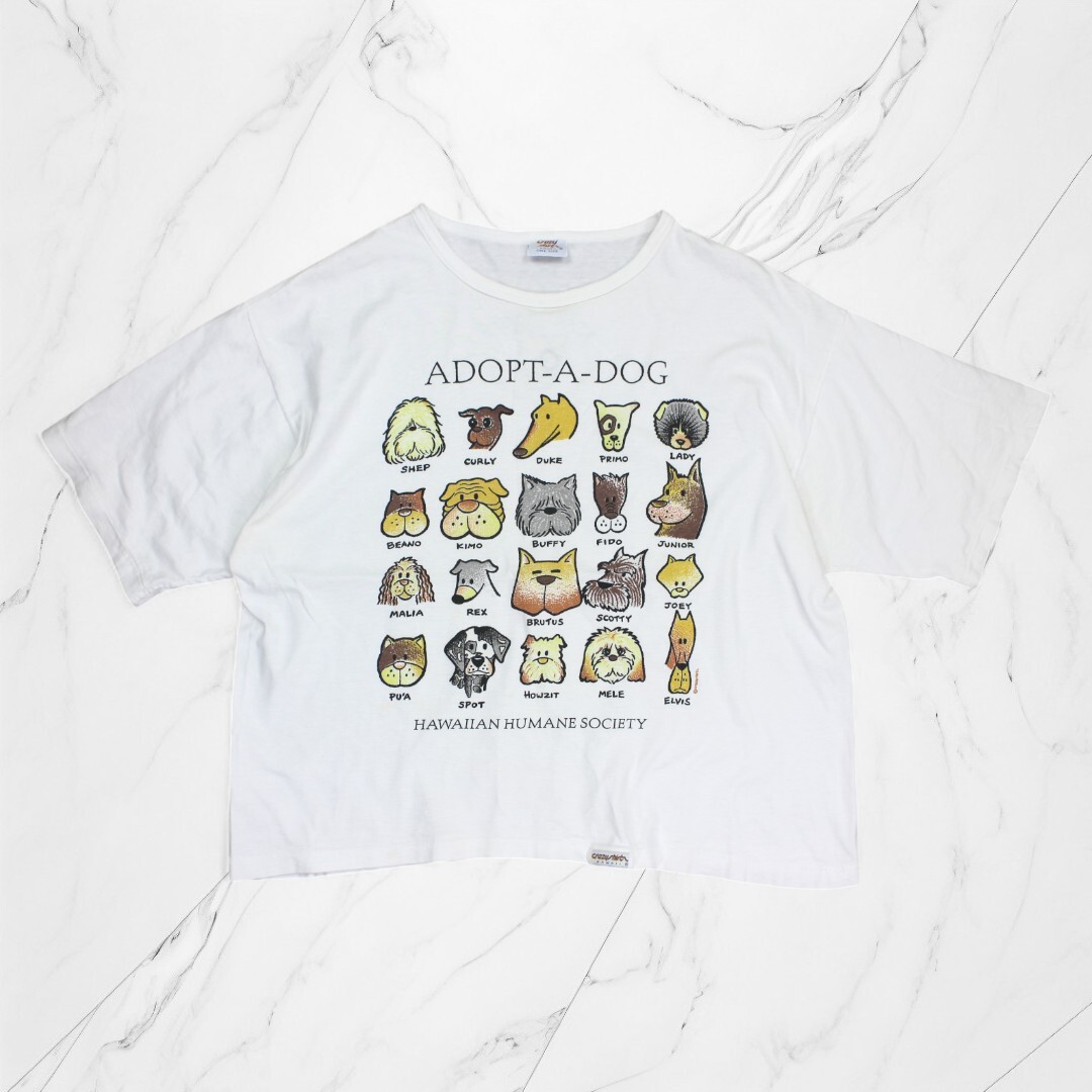 USA製、シングルステッチ仕様のヴィンテージTシャツ。短めの着丈に対して身幅がしっかりあるボックス型シルエットが特徴的です。フロント&バックにプリント入りで、古着ならではの風合いを感じられる一着です。