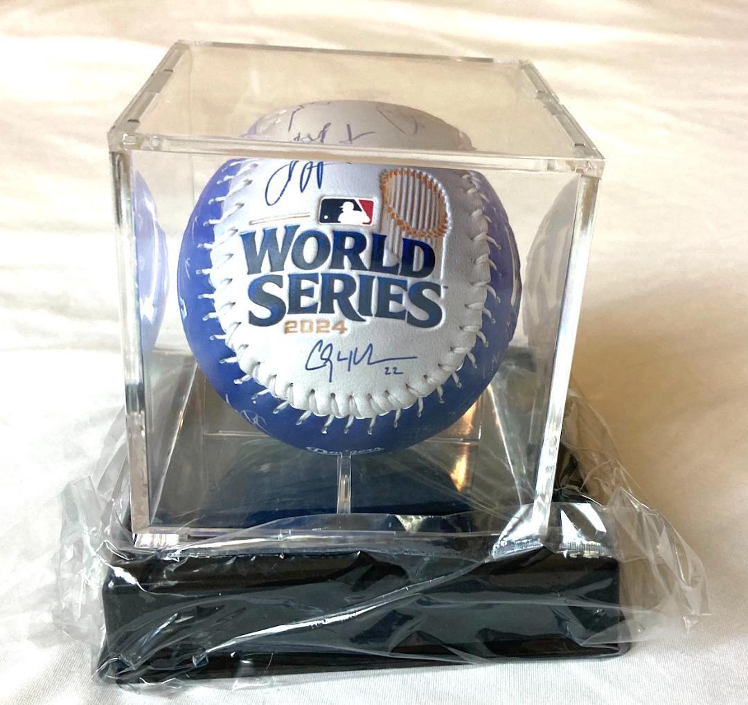 こちらのボールは2024年のロサンゼルスドジャース ワールドチャンピオンを記念して作られた記念品です。選手それぞれのサインが入っております。2枚目の画像の”Dodgers”の左にあるのが大谷選手のサインとなります。3枚目は大谷選手のサインの部分だけを拡大しております。1024個限定で発売された貴重な記念品で、透明なプラスティックケースと黒い土台もセットになってお届けいたします。正規品である証拠として、黒い台の裏にロットナンバーなどが記載されております。
